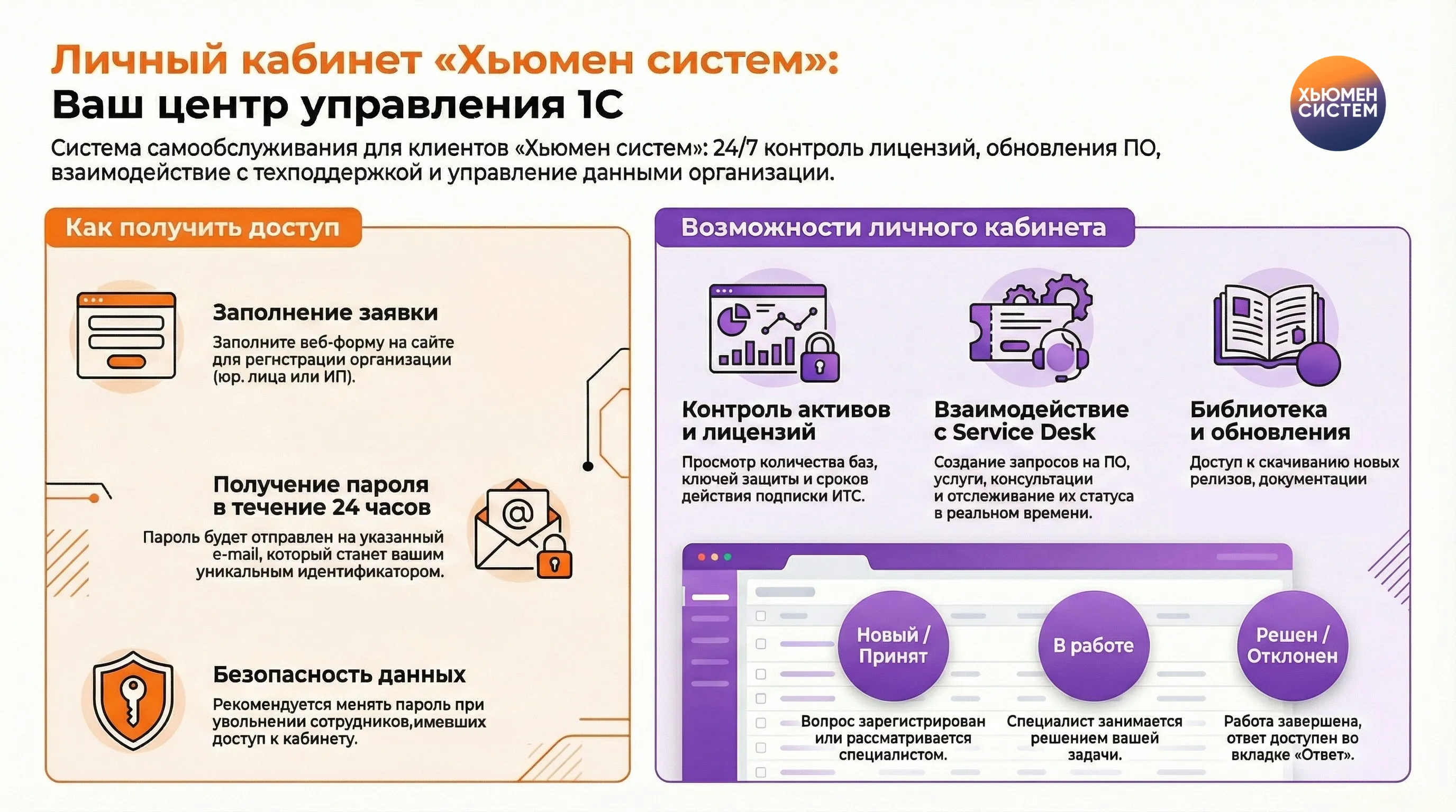 - Управлять запросами: отправлять заказы на продукты и услуги, сообщать о проблемах и отслеживать статус выполнения ваших заявок в Service Desk.
