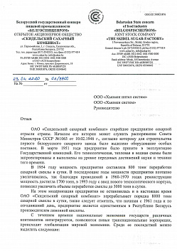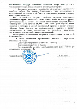 В своем отзыве ОАО «Скидельский сахарный комбинат» выражает благодарность специалистам группы компаний «Хьюмен Интел Систем» за высокий уровень профессионализма и качества исполнения автоматизации процессов ведения бухгалтерского учета согласно МСФО.
