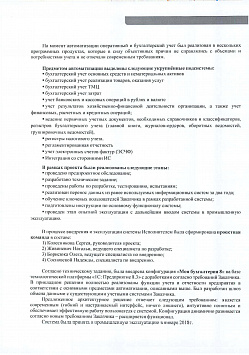 Согласно техническому заданию была внедрена конфигурация «Моя бухгалтерия 8» на базе «1С:Предприятие 8.3» с доработками согласно требованиям Заказчика. В прикладном решении полностью реализованы функции учета и отчетности предприятия в соответствии с основными предметами автоматизации. Был разработан шлюз обмена данными с существующими учетными системами Заказчика.