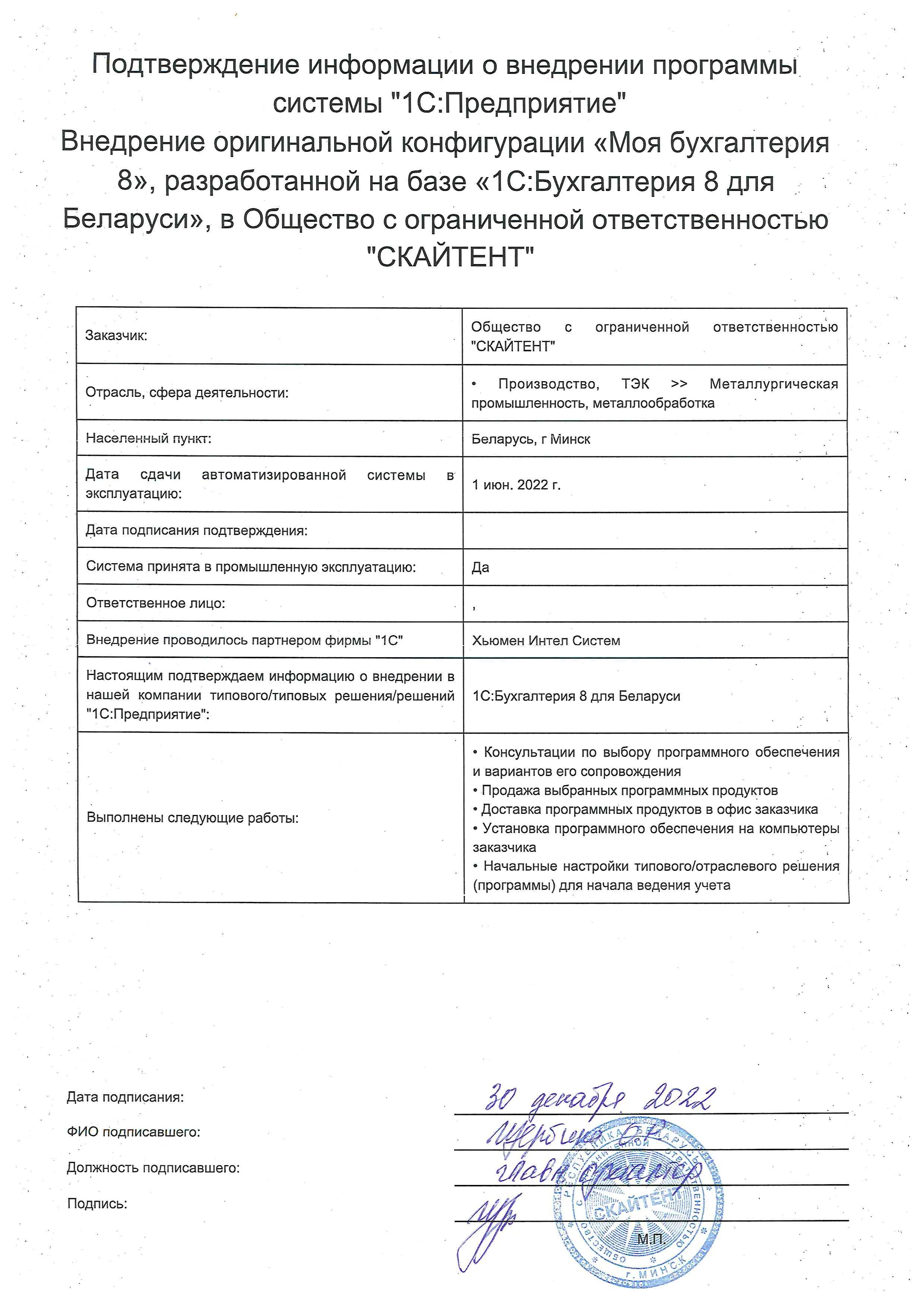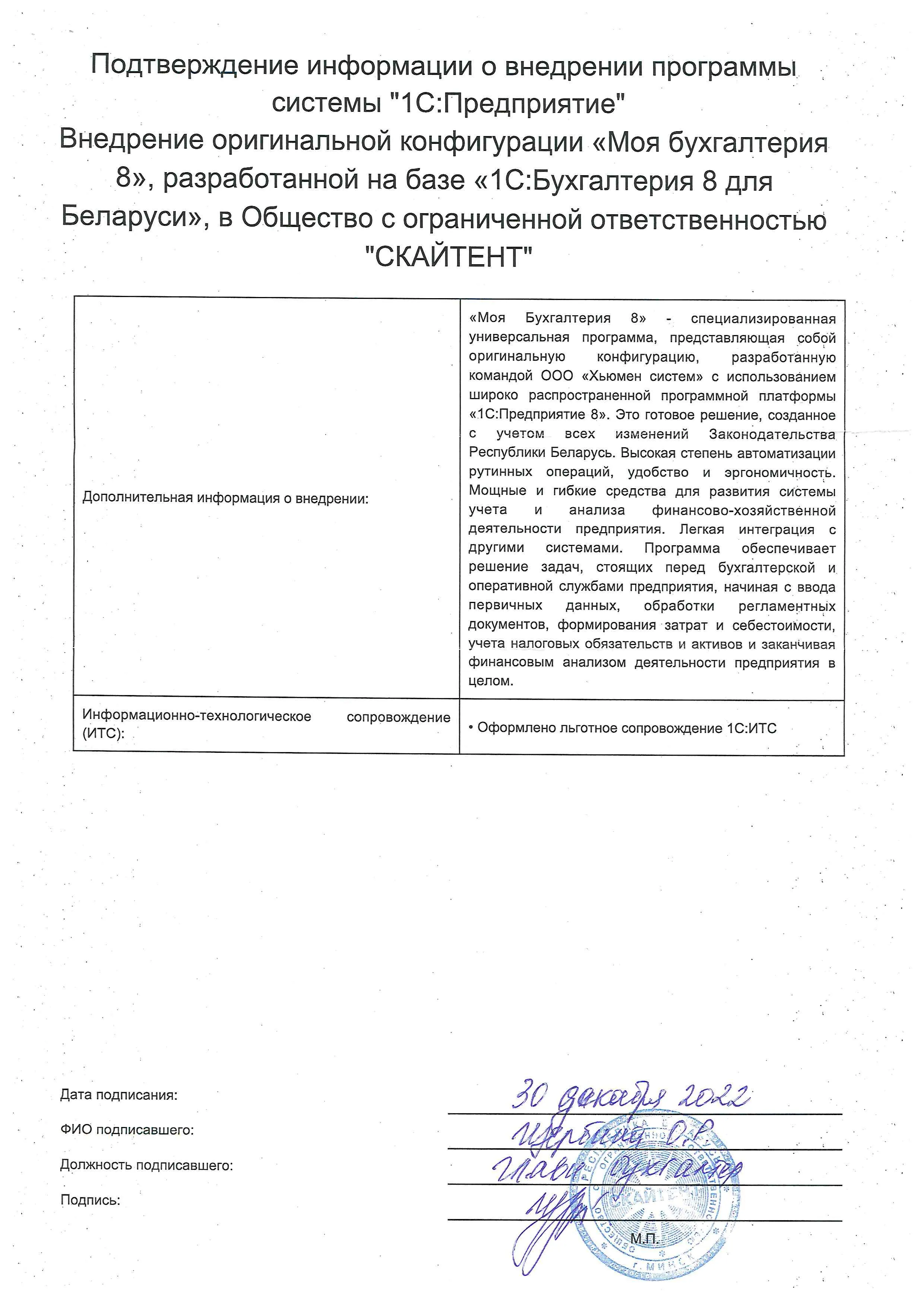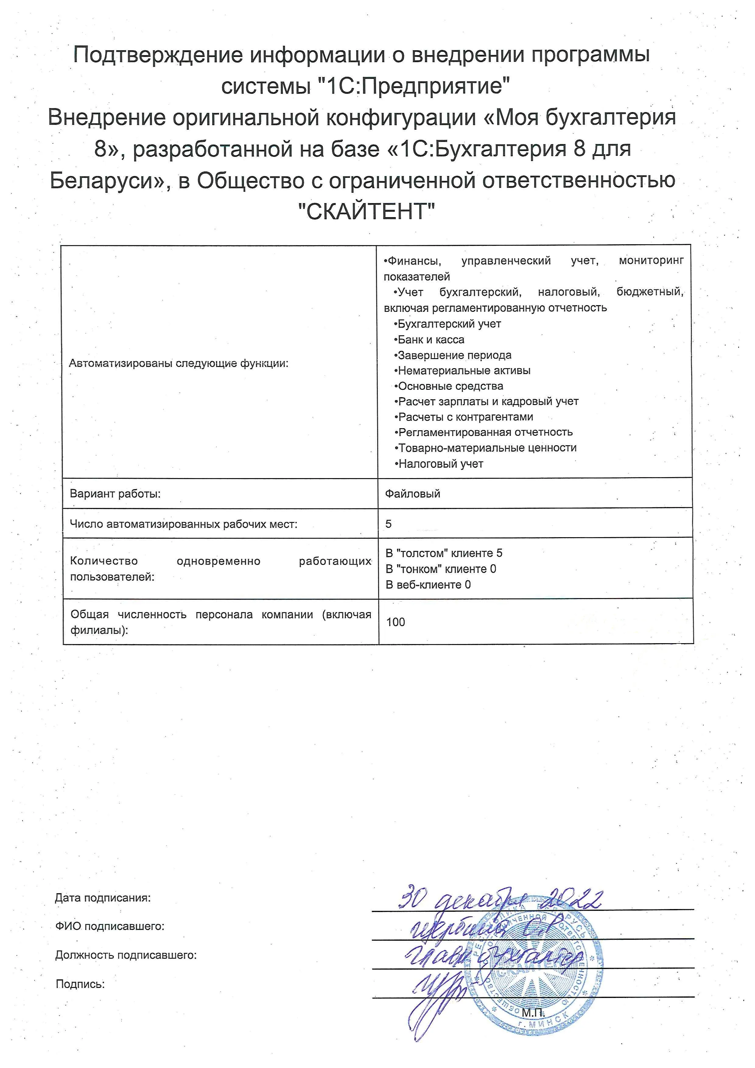 Внедрение оригинальной конфигурации «Моя бухгалтерия 8», разработанной на базе «1С:Бухгалтерия 8 для Беларуси», в Общество с ограниченной ответственностью "СКАЙТЕНТ" |