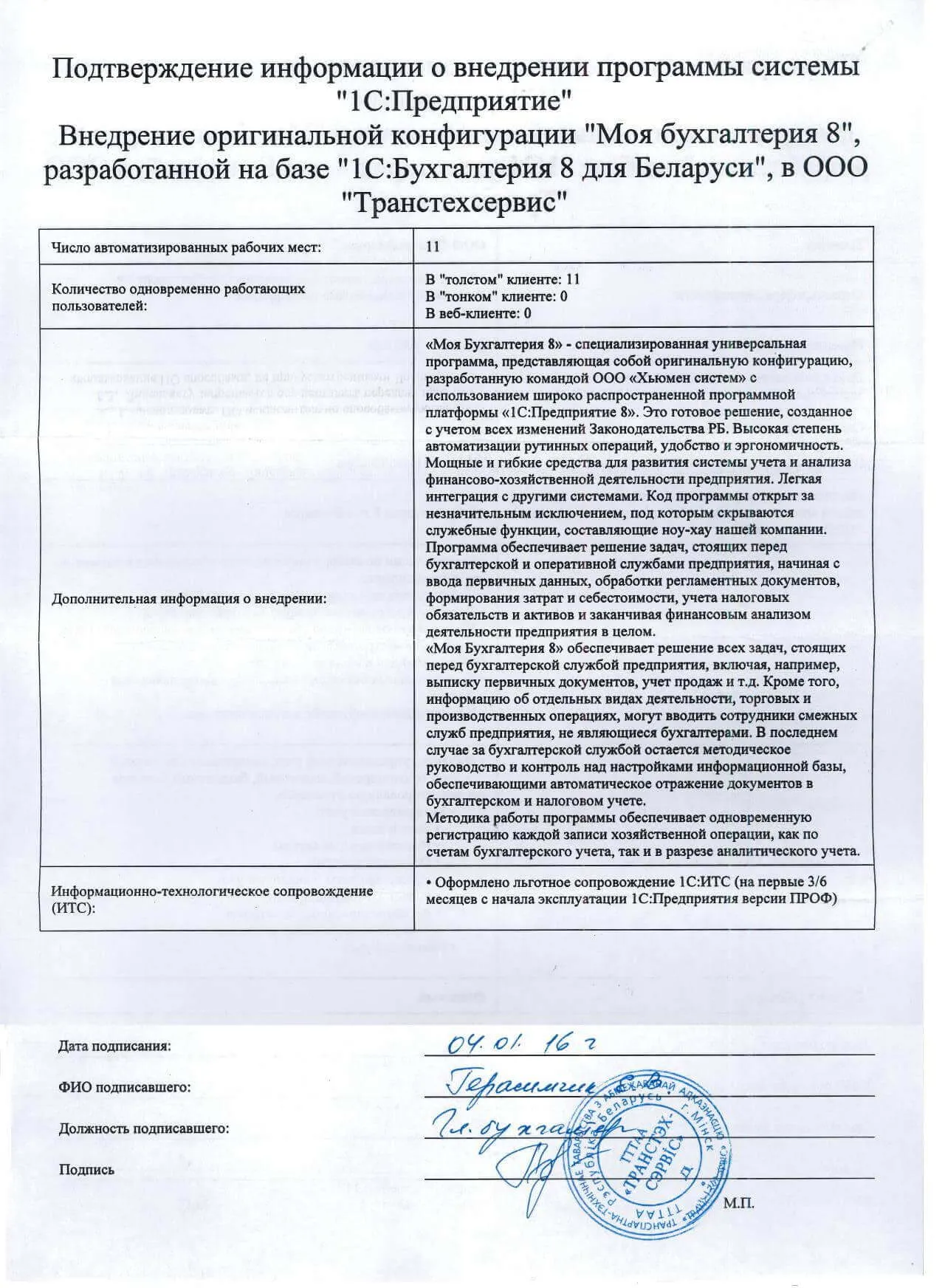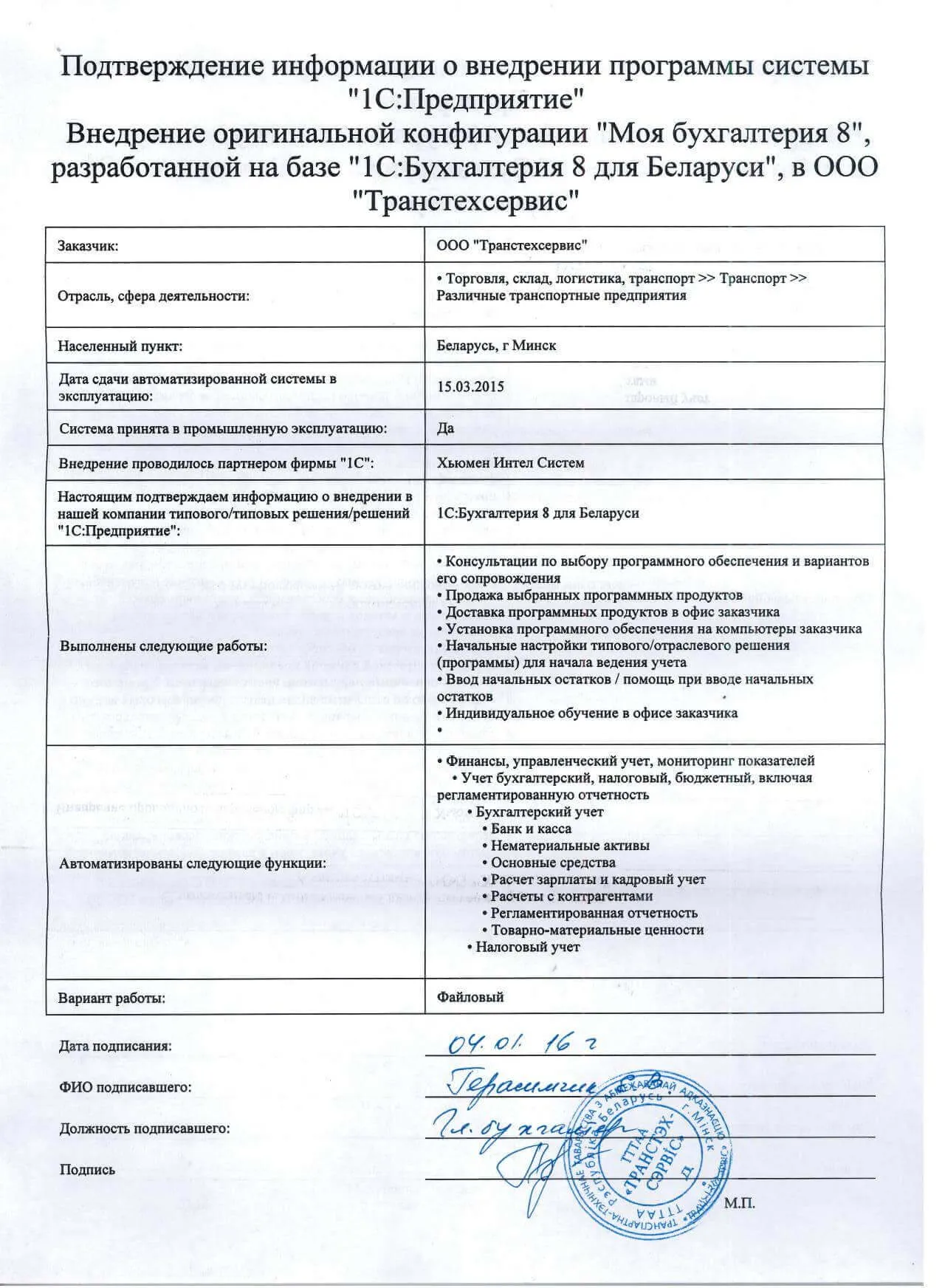 Внедрение оригинальной конфигурации "Моя бухгалтерия 8", разработанной на базе "1С:Бухгалтерия 8 для Беларуси", в ООО "Транстехсервис" |