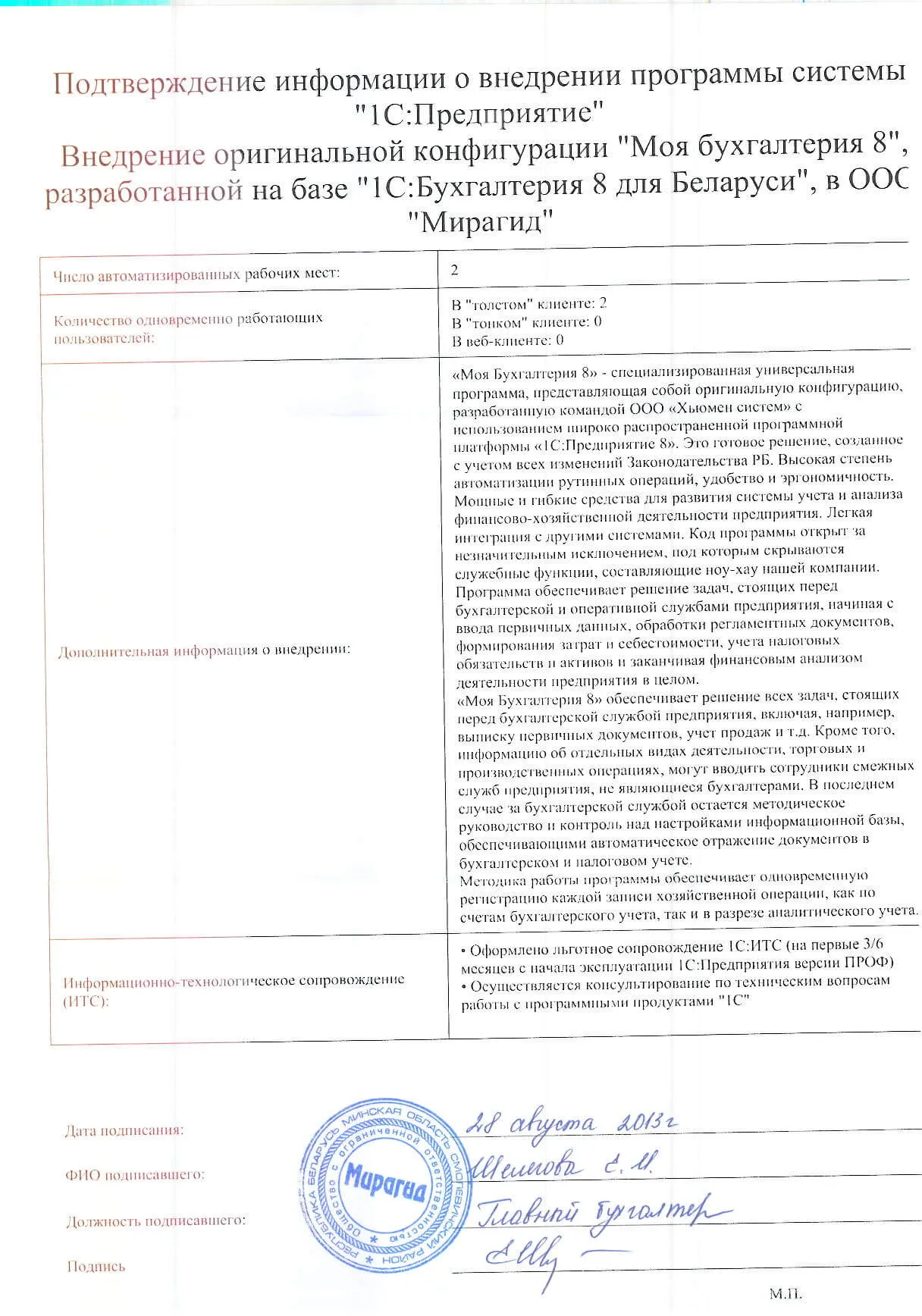 Внедрение оригинальной конфигурации "Моя бухгалтерия 8", разработанной на базе "1С:Бухгалтерия 8 для Беларуси", в Обществе с ограниченной ответственностью "Мирагид" |