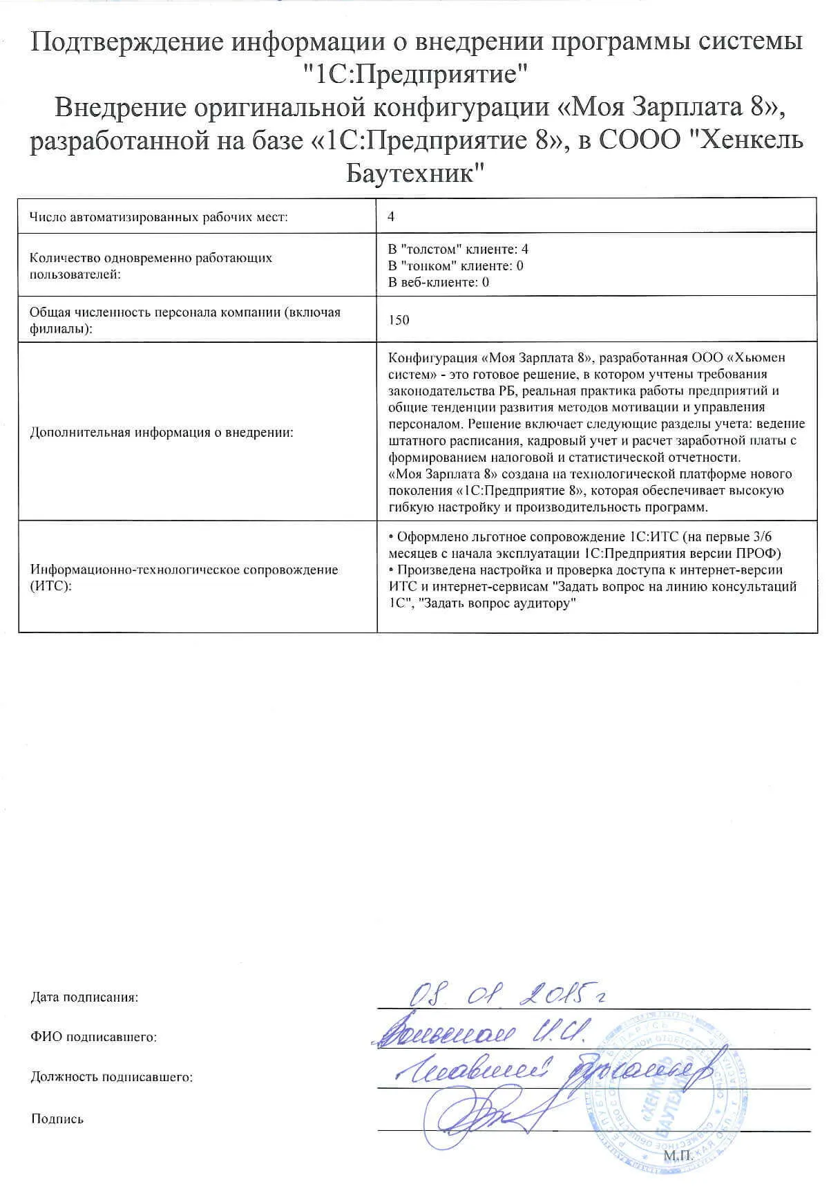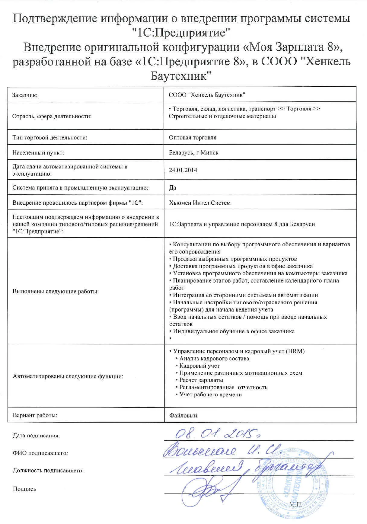 Внедрение оригинальной конфигурации «Моя Зарплата 8», разработанной на базе «1С:Предприятие 8», в СООО "Хенкель Баутехник" |