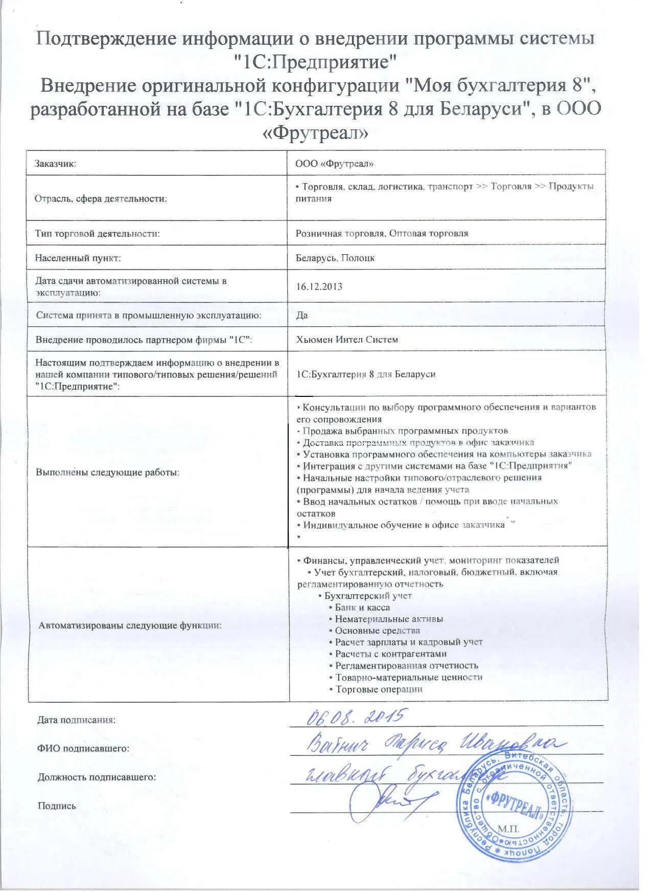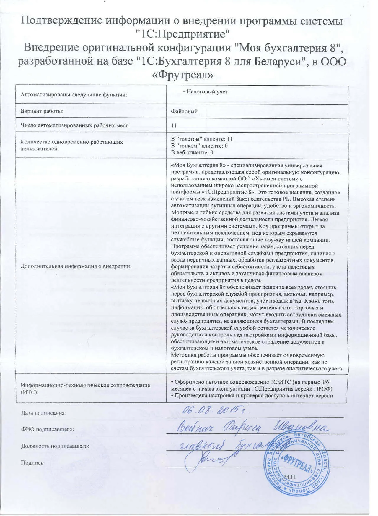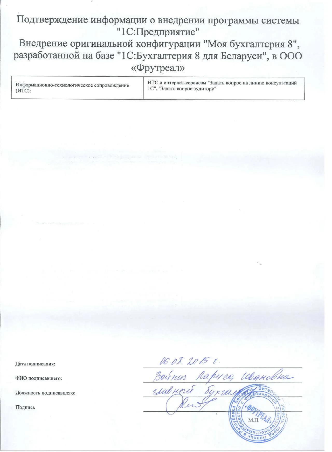 Внедрение оригинальной конфигурации "Моя бухгалтерия 8", разработанной на базе "1С:Бухгалтерия 8 для Беларуси", в ООО «Фрутреал» |