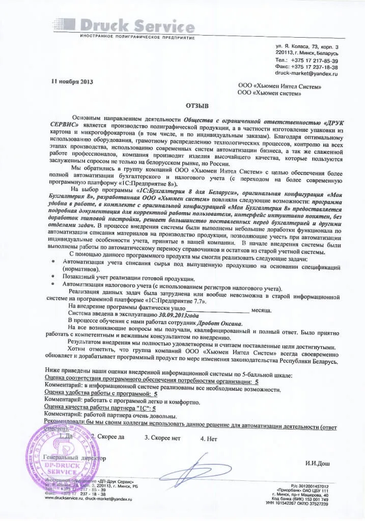 Внедрение оригинальной конфигурации "Моя бухгалтерия 8", разработанной на базе "1С:Бухгалтерия 8 для Беларуси", в ИП "ДП-Друк Сервис" |
