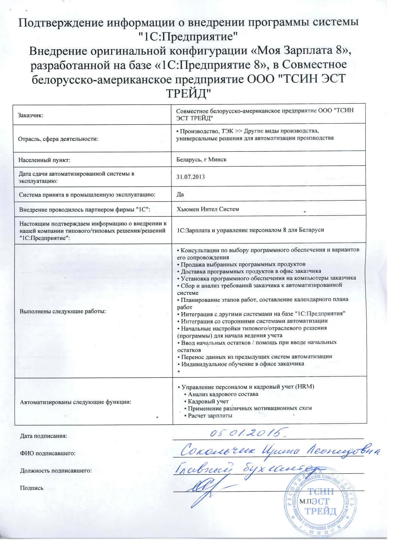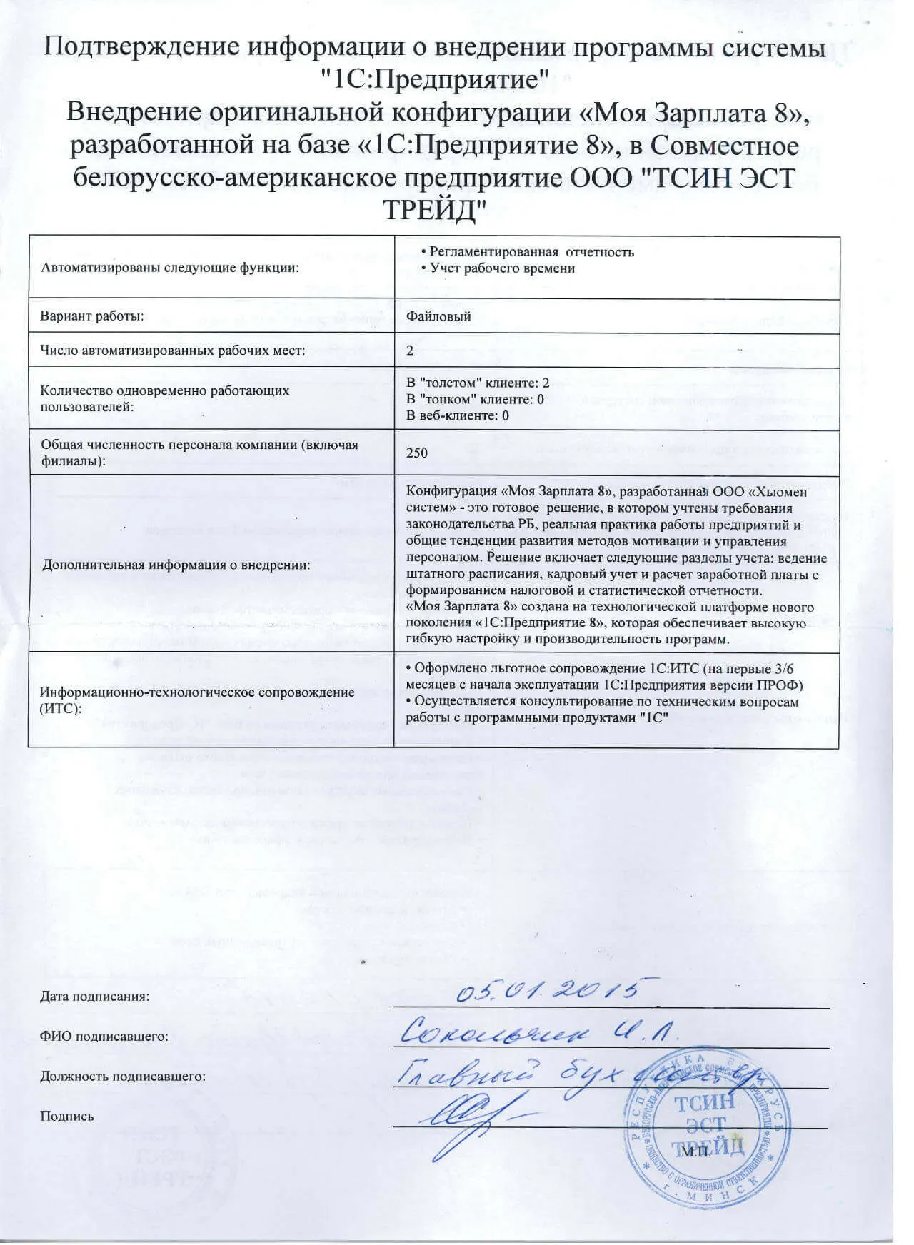 Внедрение оригинальной конфигурации «Моя Зарплата 8», разработанной на базе «1С:Предприятие 8», в Совместное белорусско-американское предприятие ООО "ТСИН ЭСТ ТРЕЙД" |
