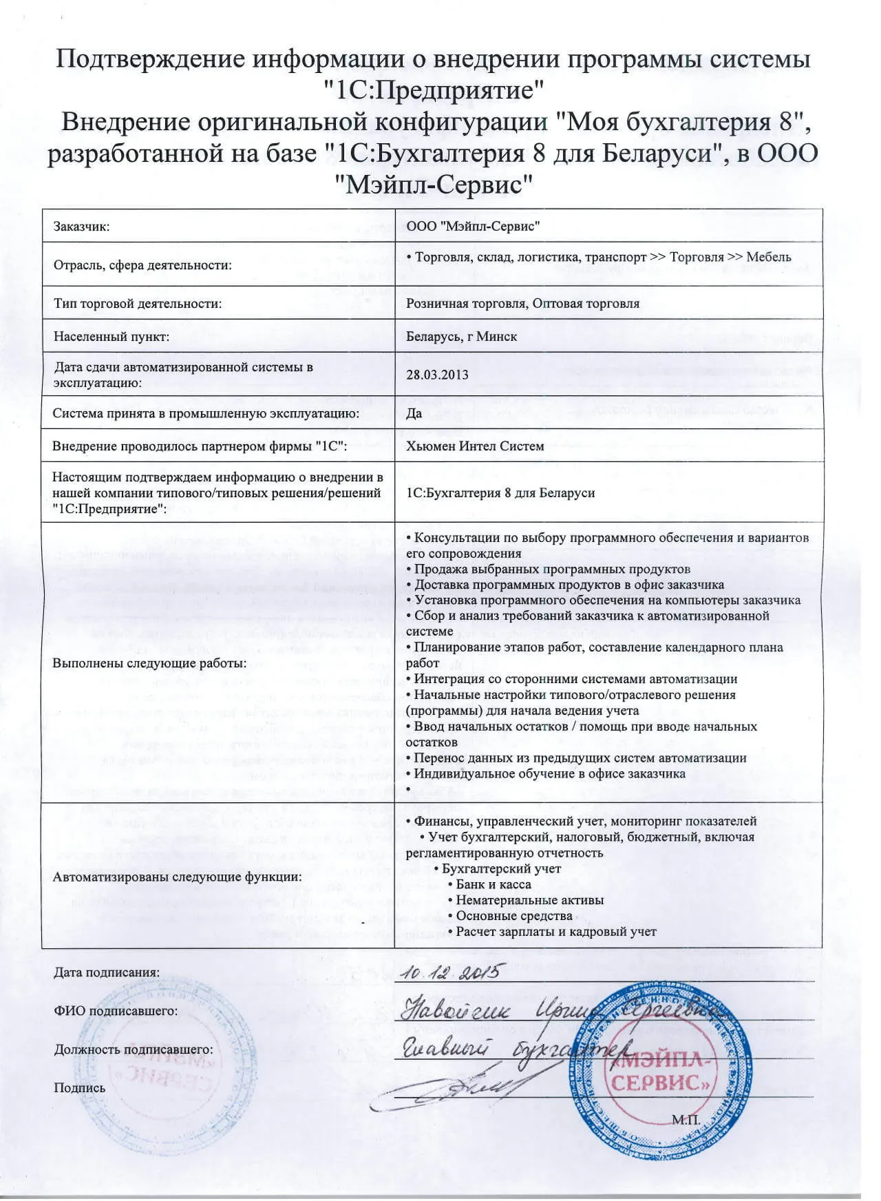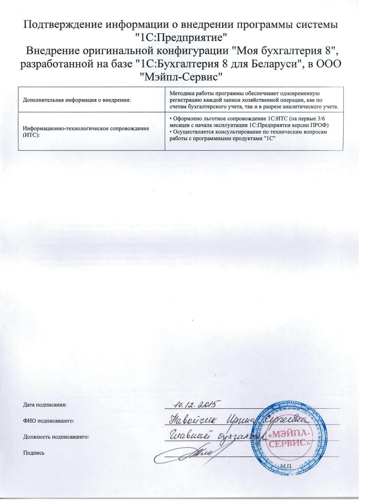 Внедрение оригинальной конфигурации "Моя бухгалтерия 8", разработанной на базе "1С:Бухгалтерия 8 для Беларуси", в ООО "Мэйпл-Сервис" |