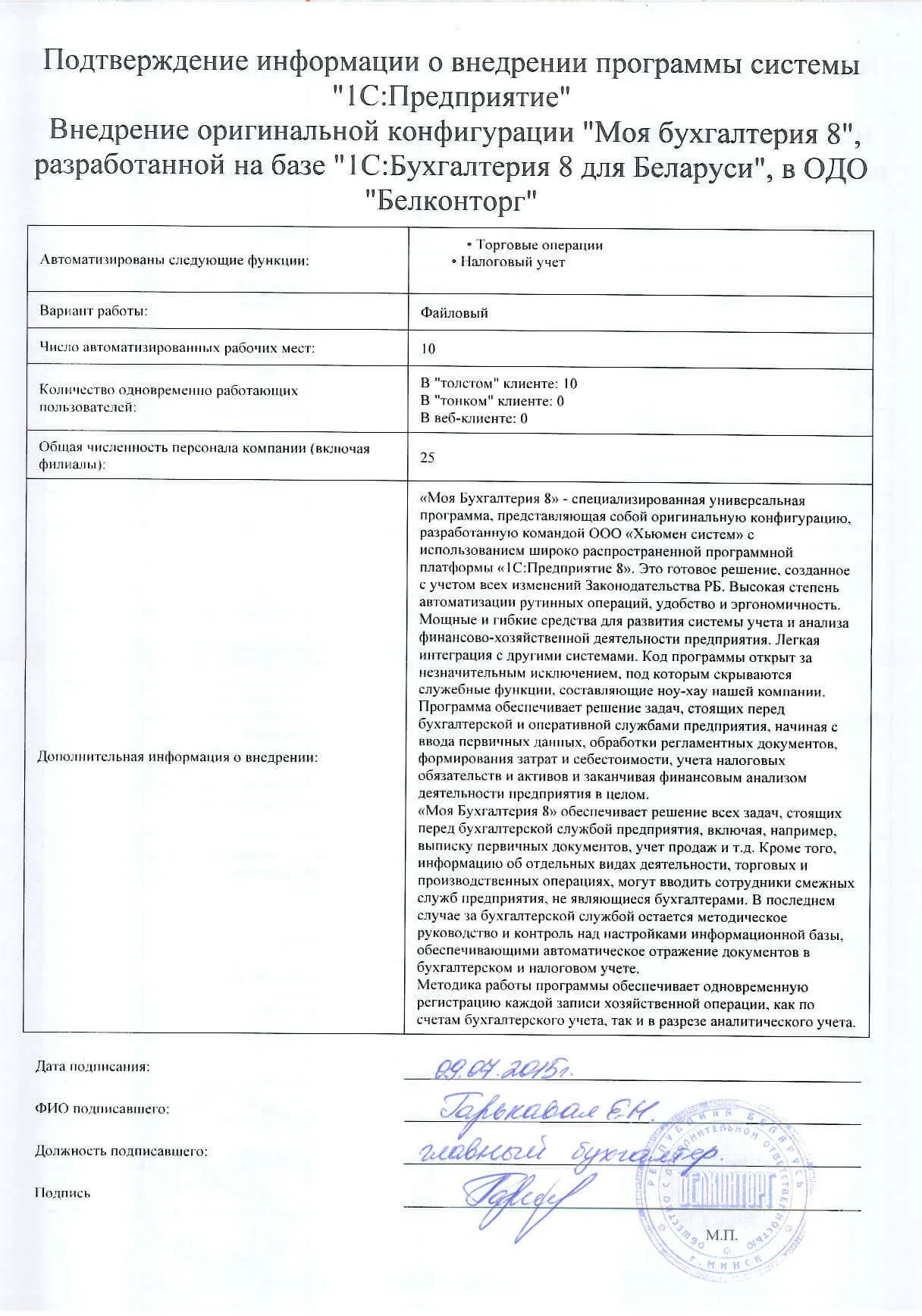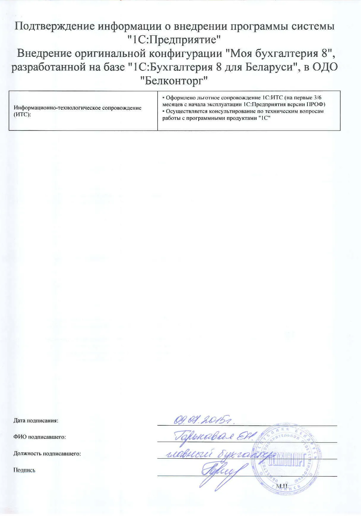 Внедрение оригинальной конфигурации "Моя бухгалтерия 8", разработанной на базе "1С:Бухгалтерия 8 для Беларуси", в ОДО "Белконторг" |