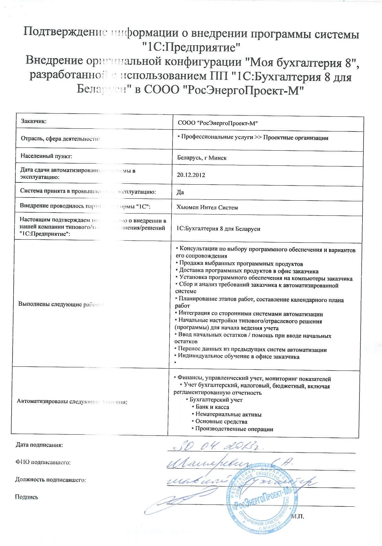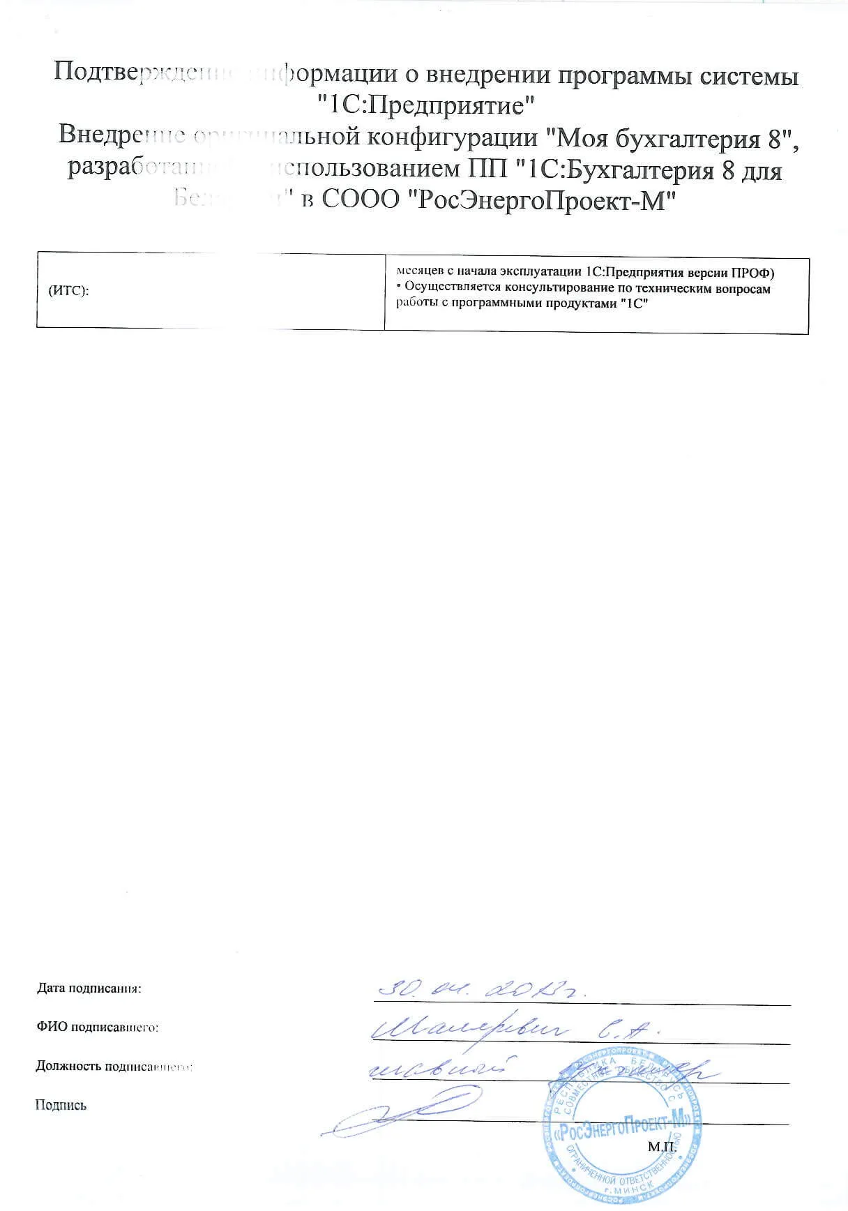 Внедрение оригинальной конфигурации "Моя бухгалтерия 8", разработанной с использованием ПП "1С:Бухгалтерия 8 для Беларуси", в СООО "РосЭнергоПроект-М" |