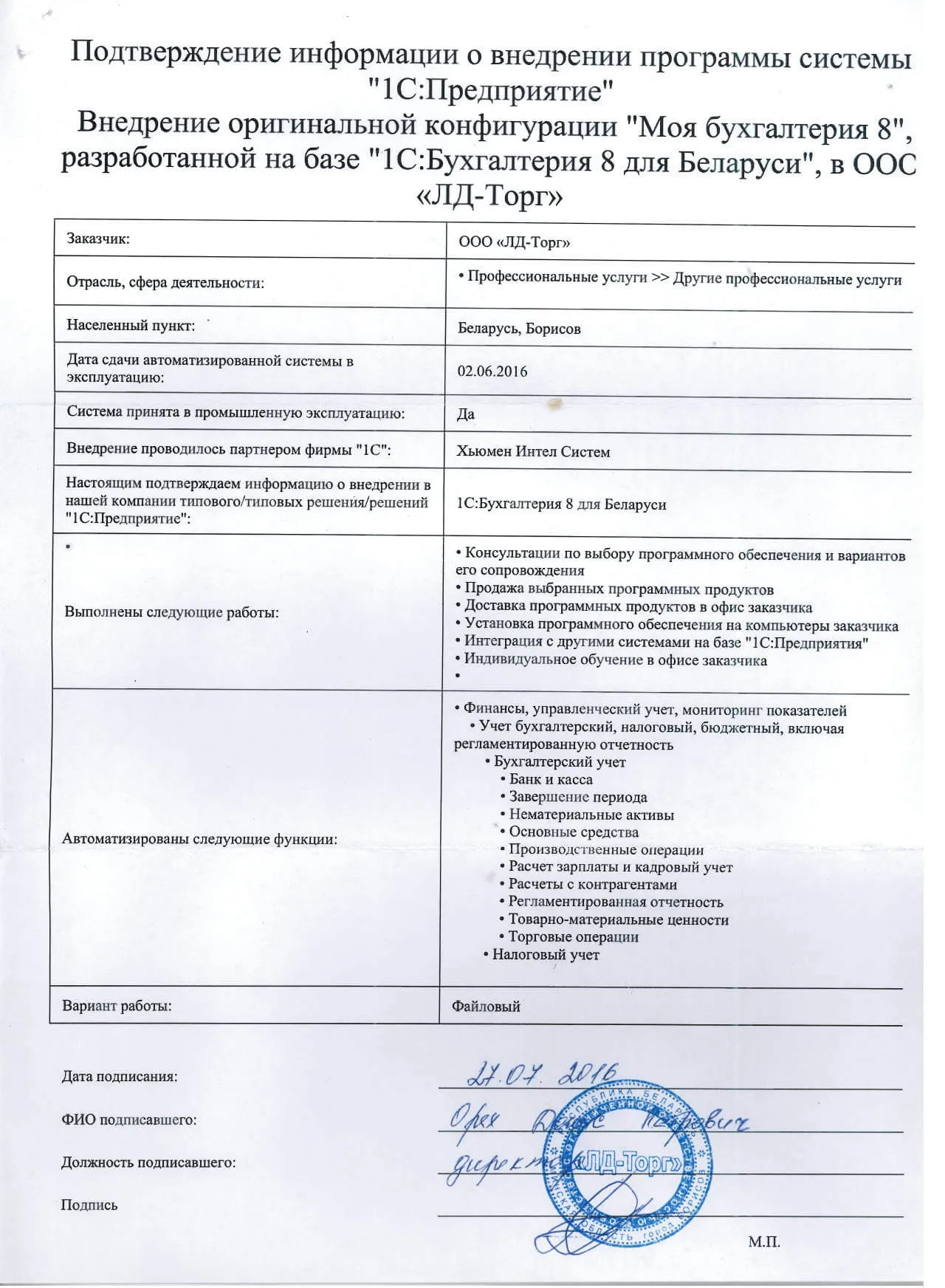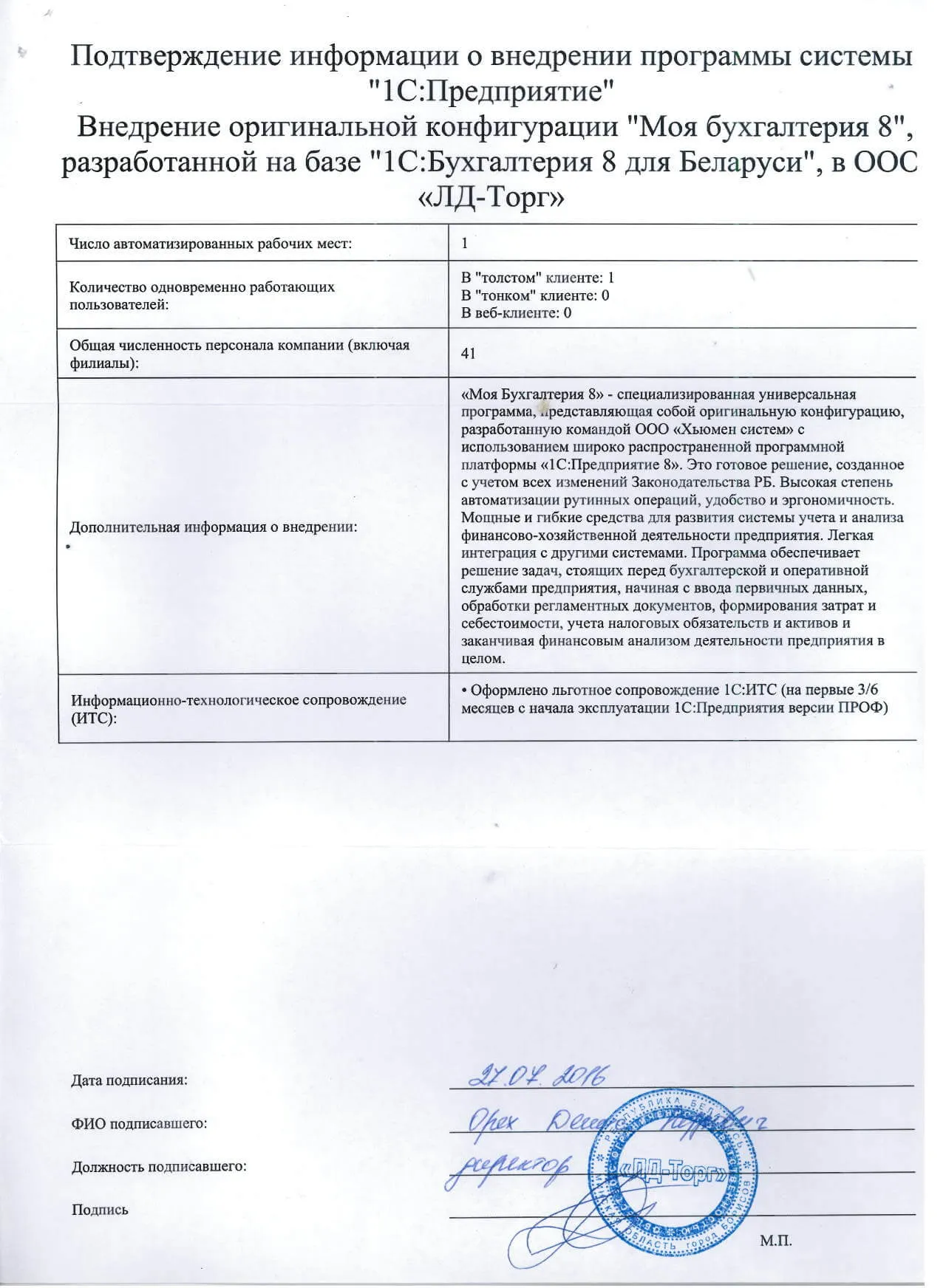 Внедрение оригинальной конфигурации "Моя бухгалтерия 8", разработанной на базе "1С:Бухгалтерия 8 для Беларуси", в ООО «ЛД-Торг» |
