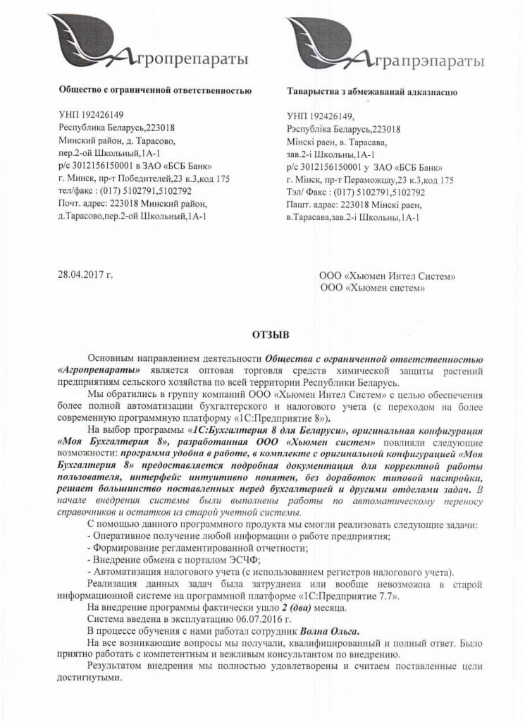 Внедрение оригинальной конфигурации "Моя бухгалтерия 8", разработанной на базе "1С:Бухгалтерия 8 для Беларуси", в Общество с ограниченной ответственностью "Агропрепараты" |
