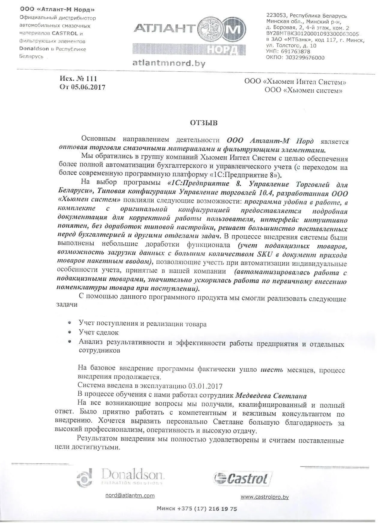 Внедрение оригинальной конфигурации "Моя бухгалтерия 8", разработанной на базе "1С:Бухгалтерия 8 для Беларуси", в Общество с ограниченной ответственностью «Атлант-М Норд» |