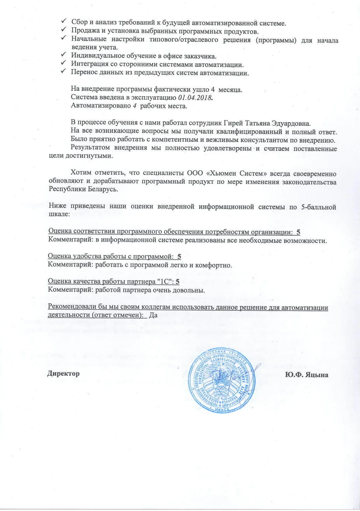 Консультации по выбору программного обеспечения и вариантов его сопровождения;Продажа выбранных программных продуктов;Доставка программных продуктов в офис заказчика;Установка программного обеспечения на компьютеры заказчика;Сбор и анализ требований заказчика к автоматизированной системе;Интеграция с другими системами на базе "1С:Предприятия";Начальные настройки типового/отраслевого решения (программы) для начала ведения учета;Индивидуальное обучение в офисе заказчика |