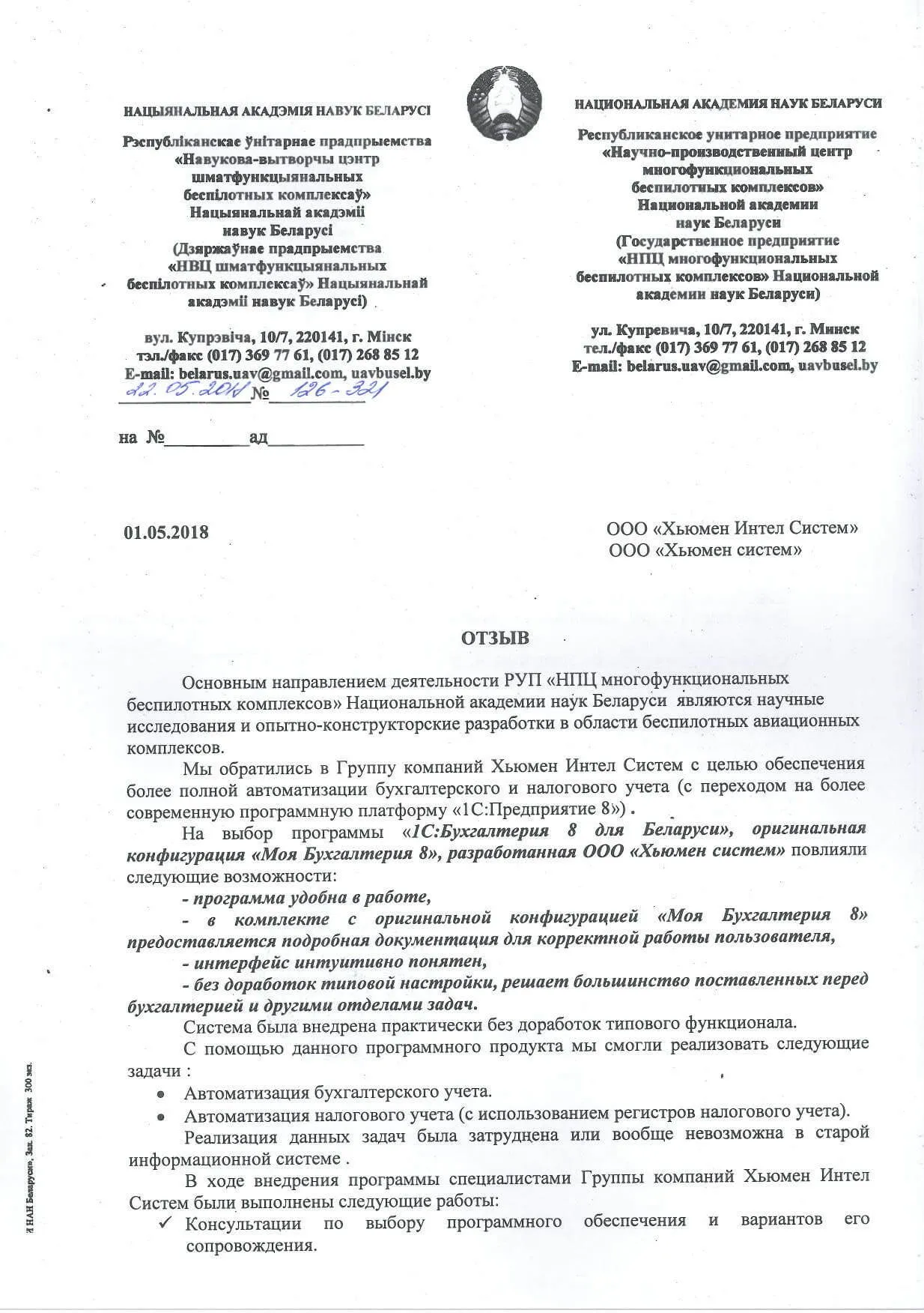 Внедрение оригинальной конфигурации "Моя бухгалтерия 8", разработанной на базе "1С:Бухгалтерия 8 для Беларуси", в РУП «НПЦ многофункциональных беспилотных комплексов» Национальной академии наук Беларуси |