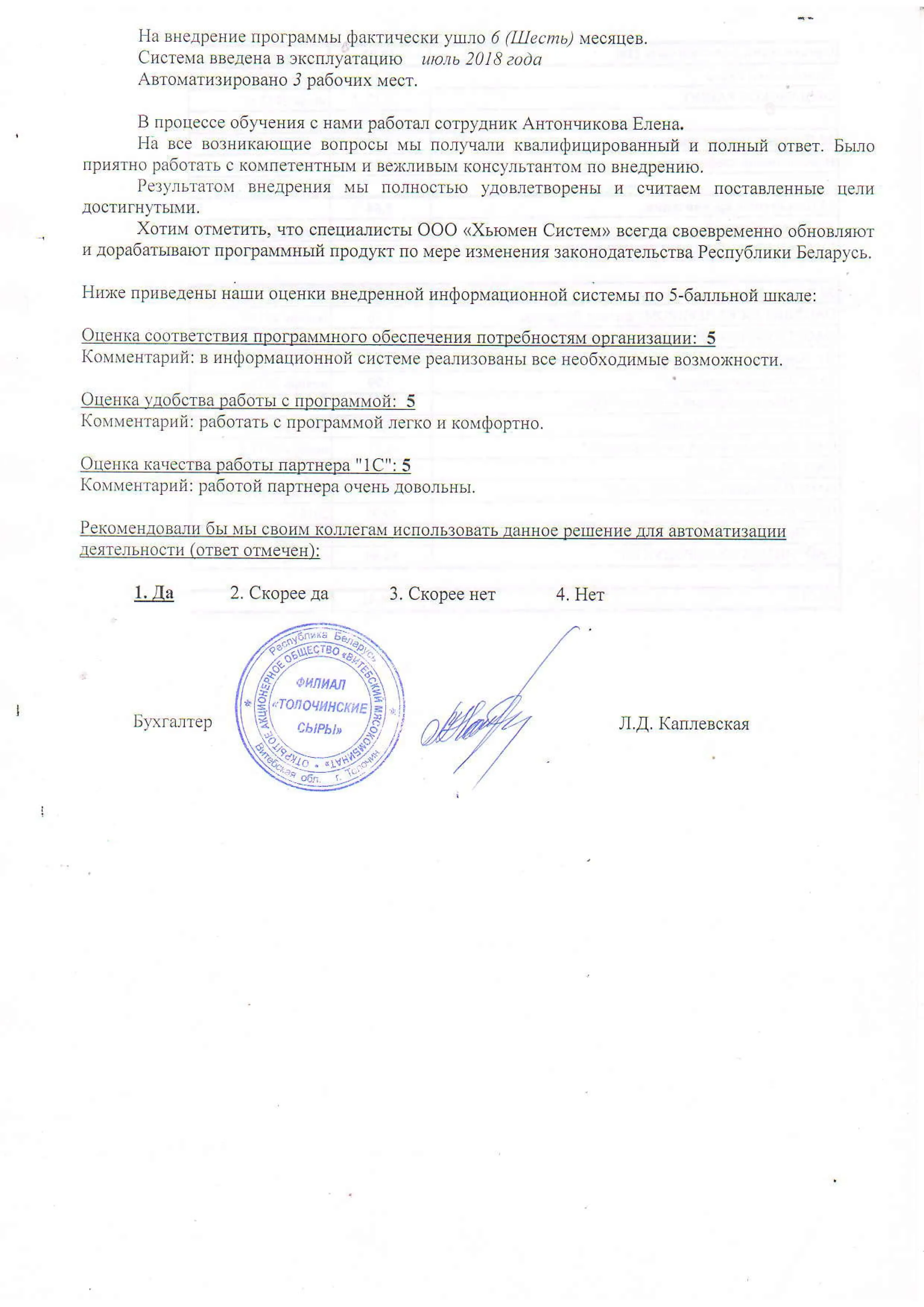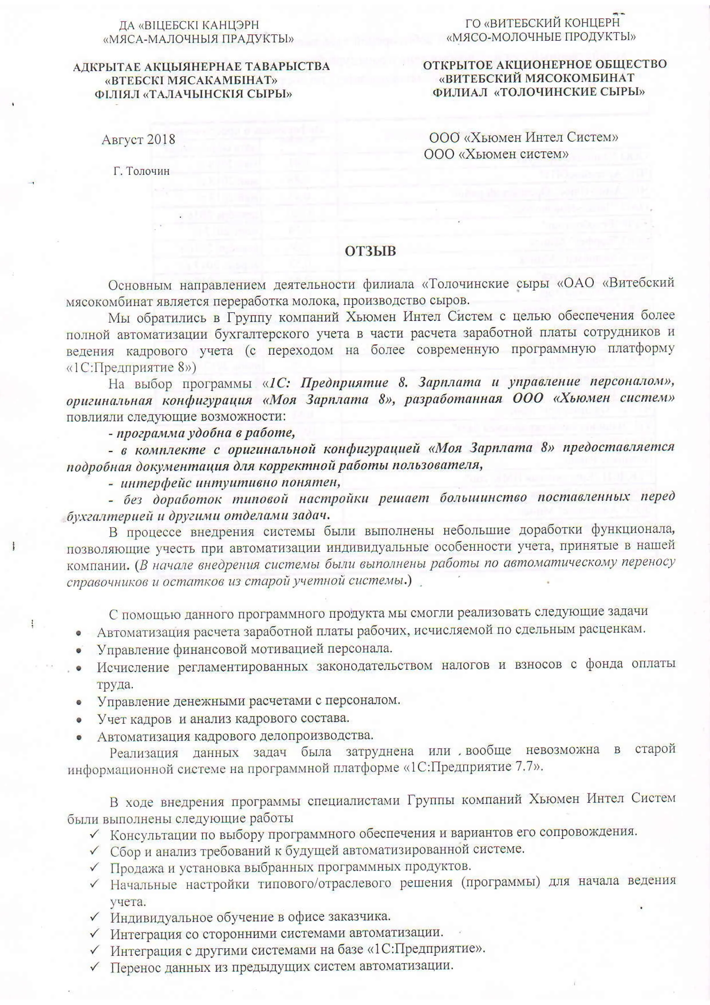 Внедрение оригинальной конфигурации «Моя Зарплата 8», разработанной на базе «1С:Предприятие 8», в Филиал «Толочинские сыры» ОАО «Витебский мясокомбинат» |