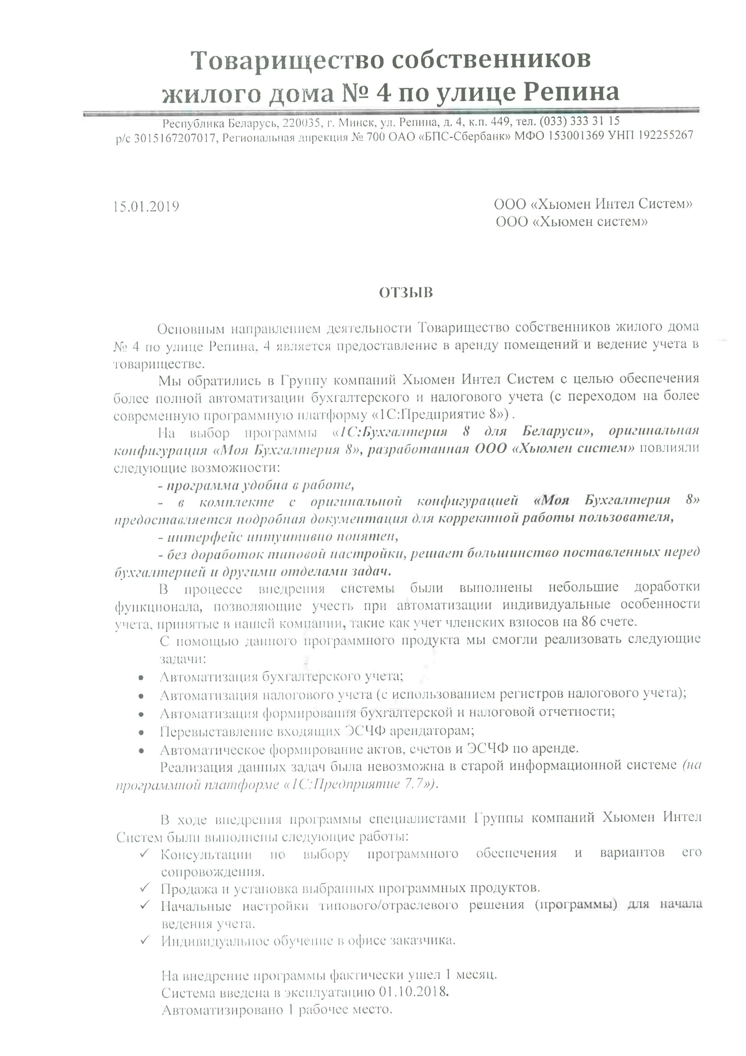 Внедрение оригинальной конфигурации «Моя бухгалтерия 8», разработанной на базе «1С:Бухгалтерия 8 для Беларуси», в Товарищество собственников жилого дома № 4 по улице Репина, 4 |