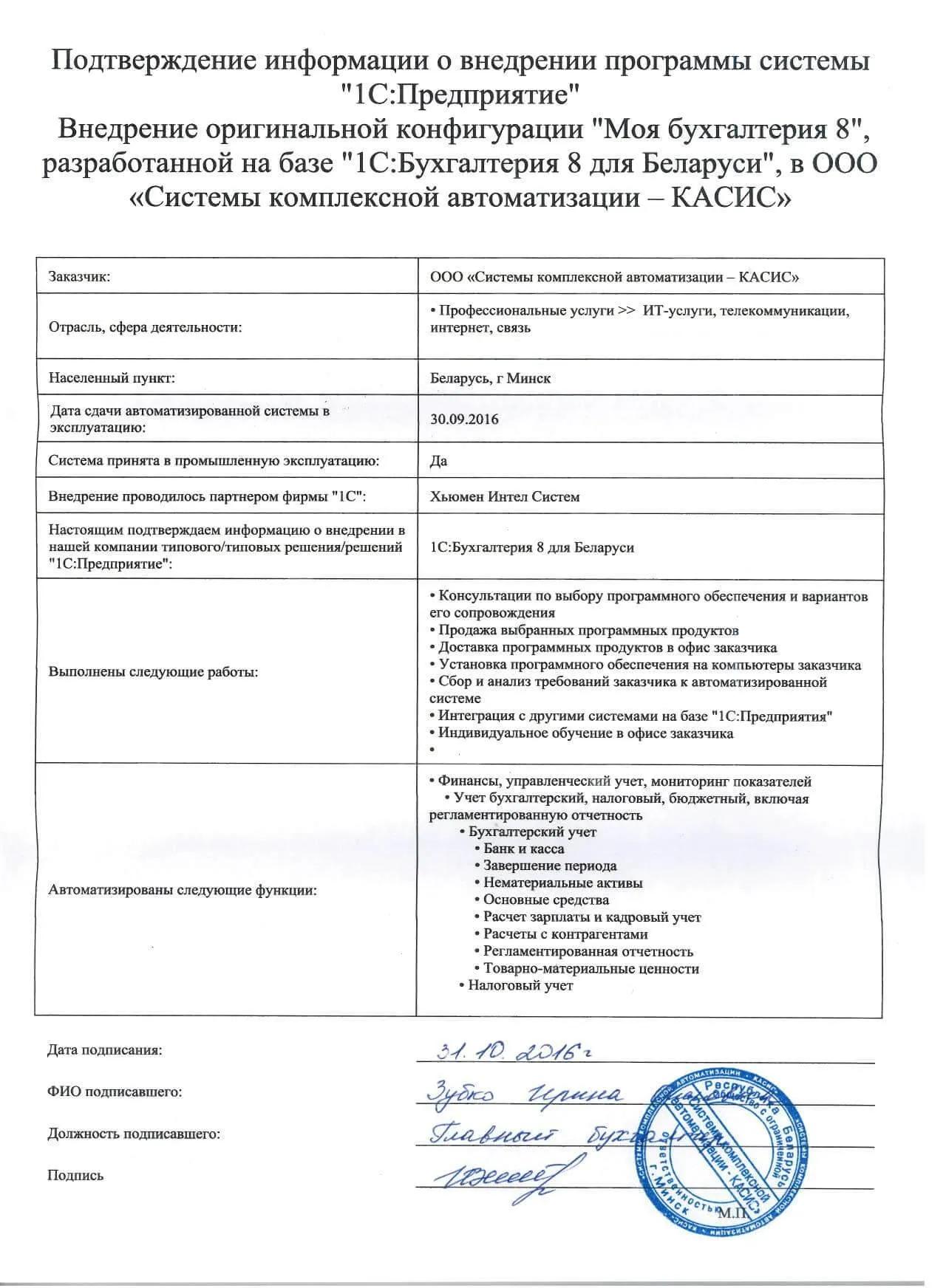 Внедрение оригинальной конфигурации "Моя бухгалтерия 8", разработанной на базе "1С:Бухгалтерия 8 для Беларуси", в ООО «Системы комплексной автоматизации – КАСИС» |