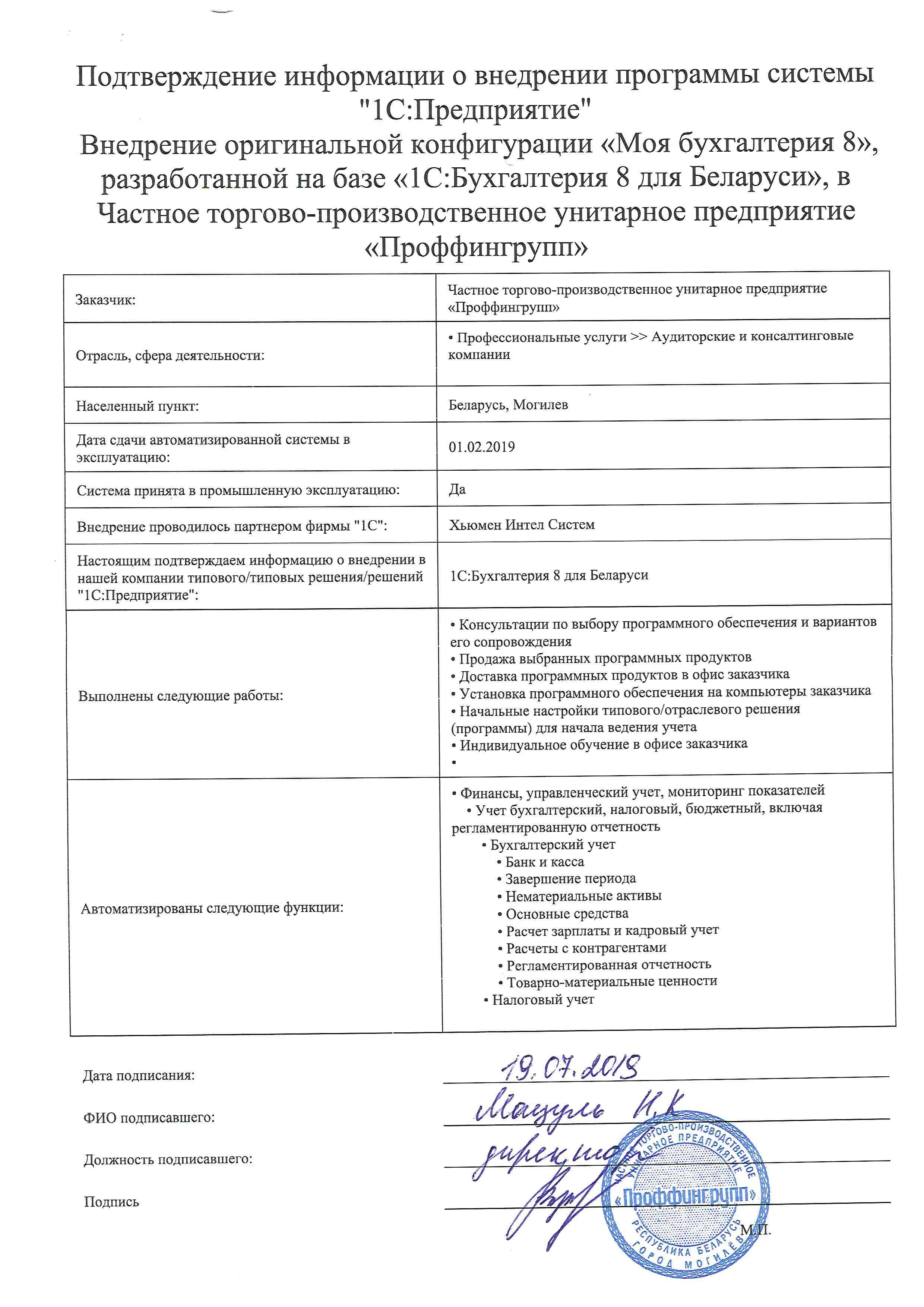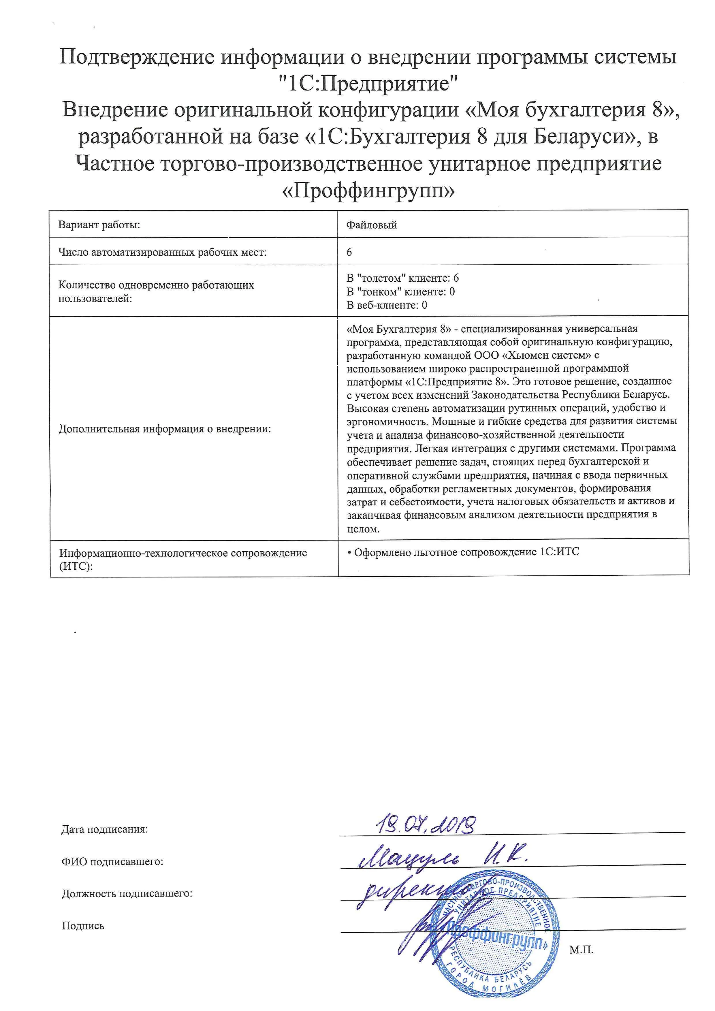 Внедрение оригинальной конфигурации «Моя бухгалтерия 8», разработанной на базе «1С:Бухгалтерия 8 для Беларуси», в Частное торгово-производственное унитарное предприятие «Проффингрупп» |