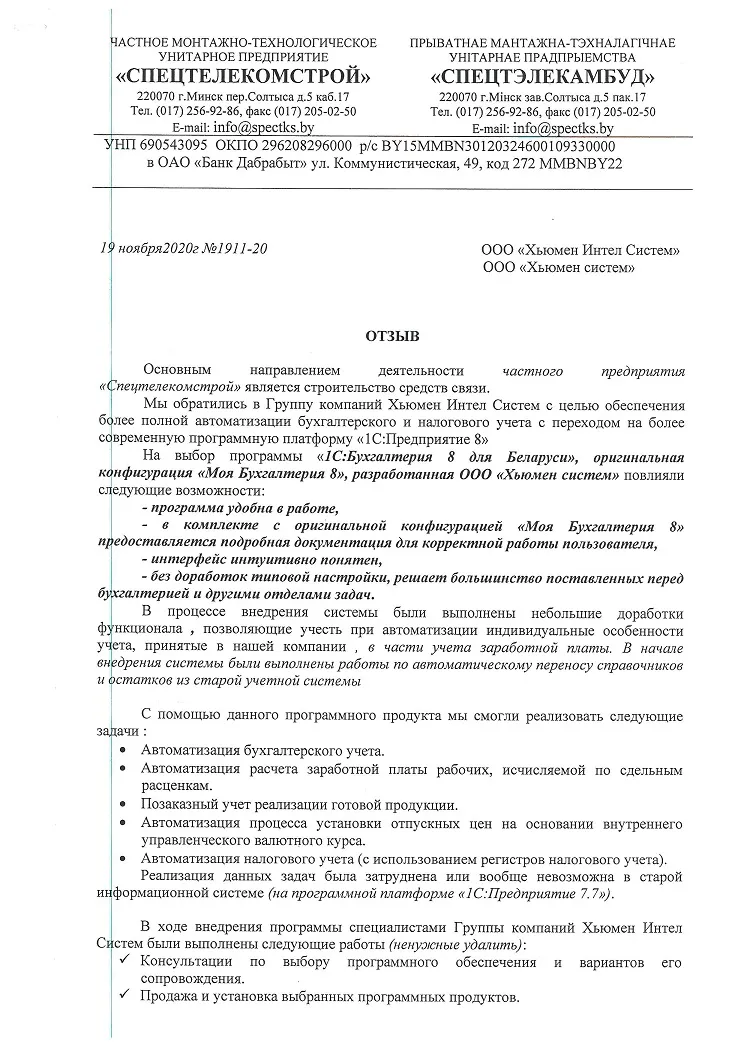 Внедрение оригинальной конфигурации «Моя бухгалтерия 8», разработанной на базе «1С:Бухгалтерия 8 для Беларуси», в Частное монтажно-технологическое унитарное предприятие «Спецтелекомстрой» |