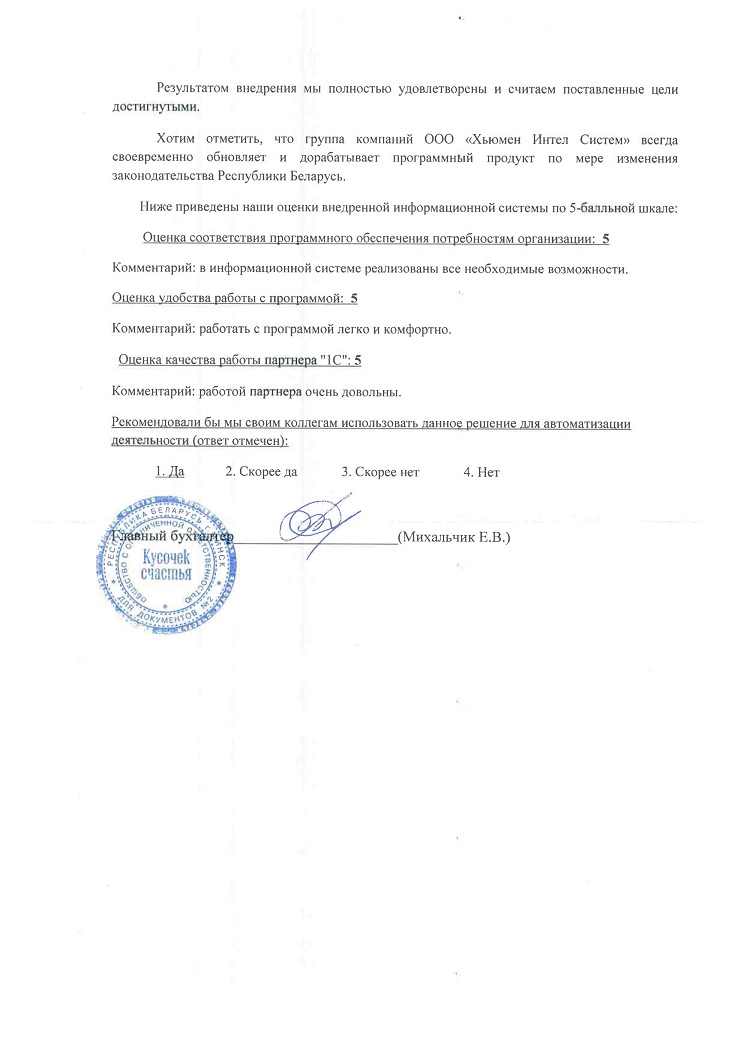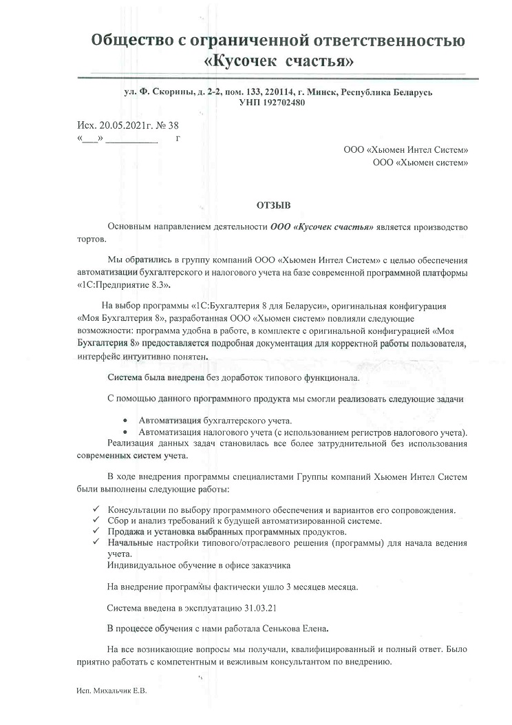 Внедрение оригинальной конфигурации «Моя бухгалтерия 8», разработанной на базе «1С:Бухгалтерия 8 для Беларуси», в ООО "Кусочек счастья" |