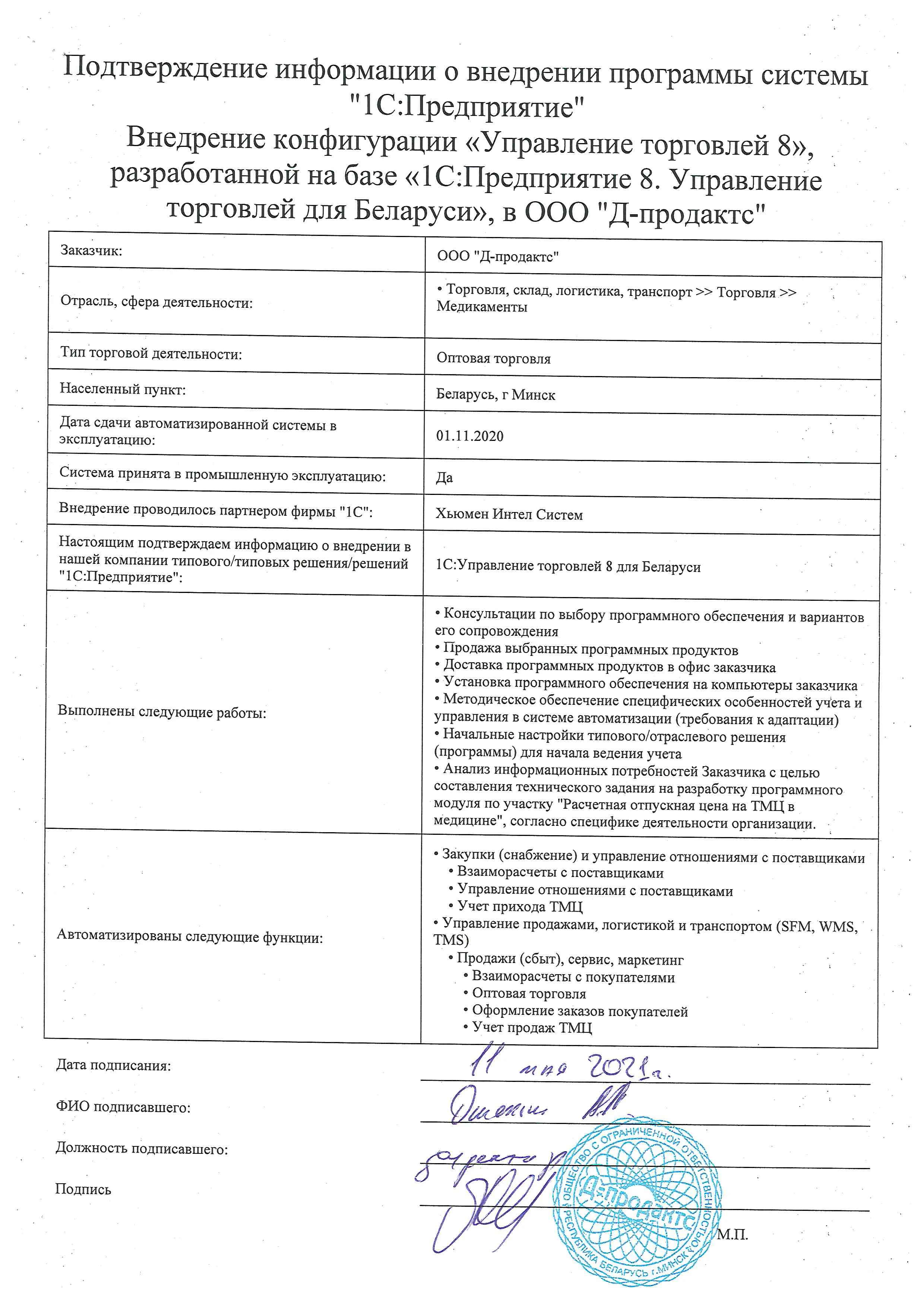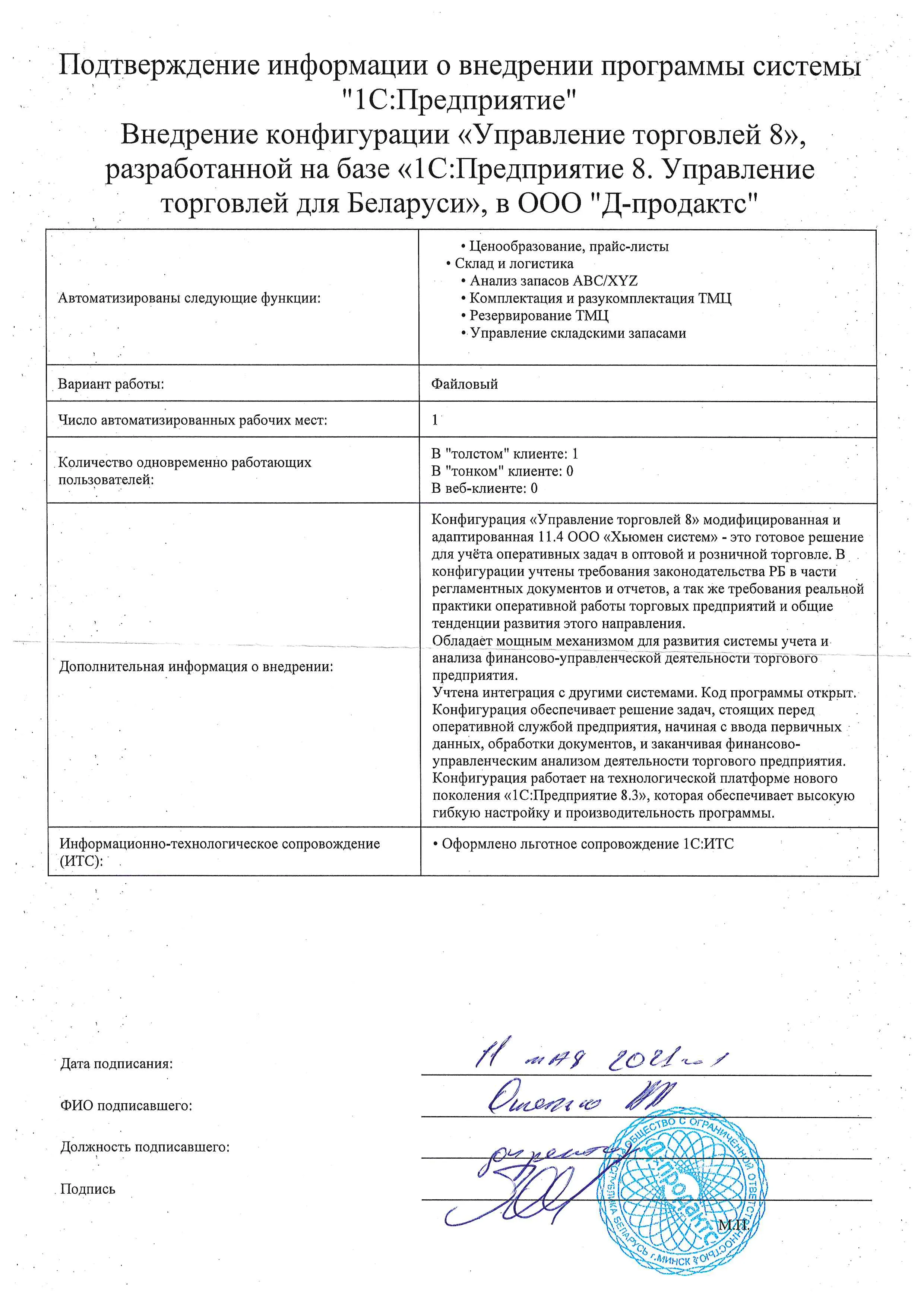 Внедрение конфигурации «Управление торговлей 8», разработанной на базе «1С:Предприятие 8. Управление торговлей для Беларуси», в ООО "Д-продактс" |