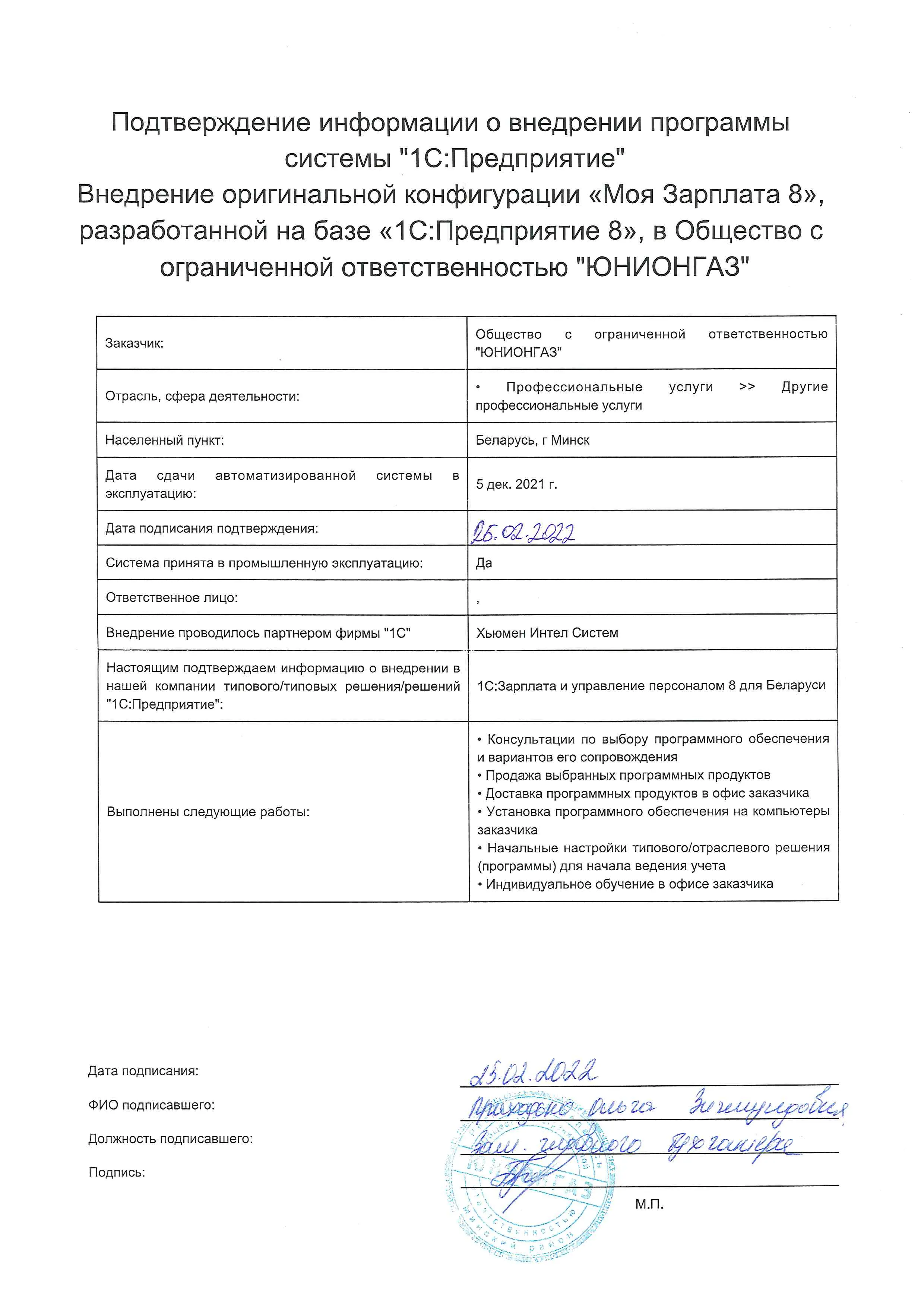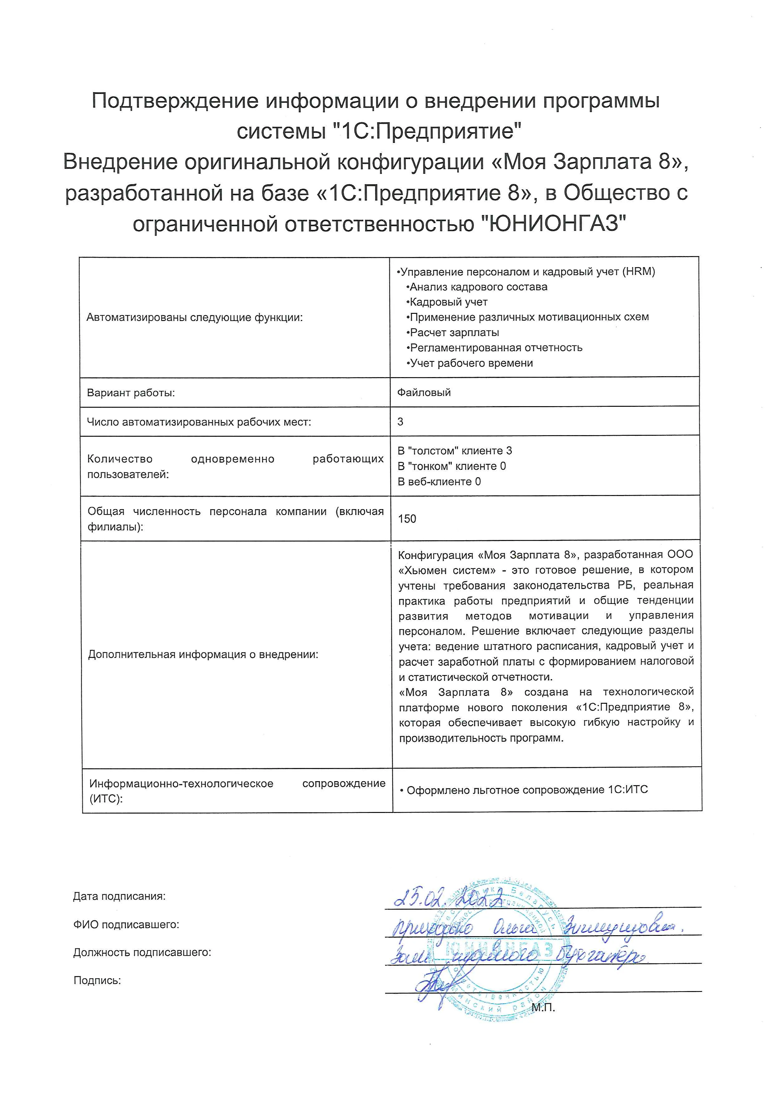 Внедрение оригинальной конфигурации «Моя Зарплата 8», разработанной на базе «1С:Предприятие 8», в Общество с ограниченной ответственностью "ЮНИОНГАЗ" |