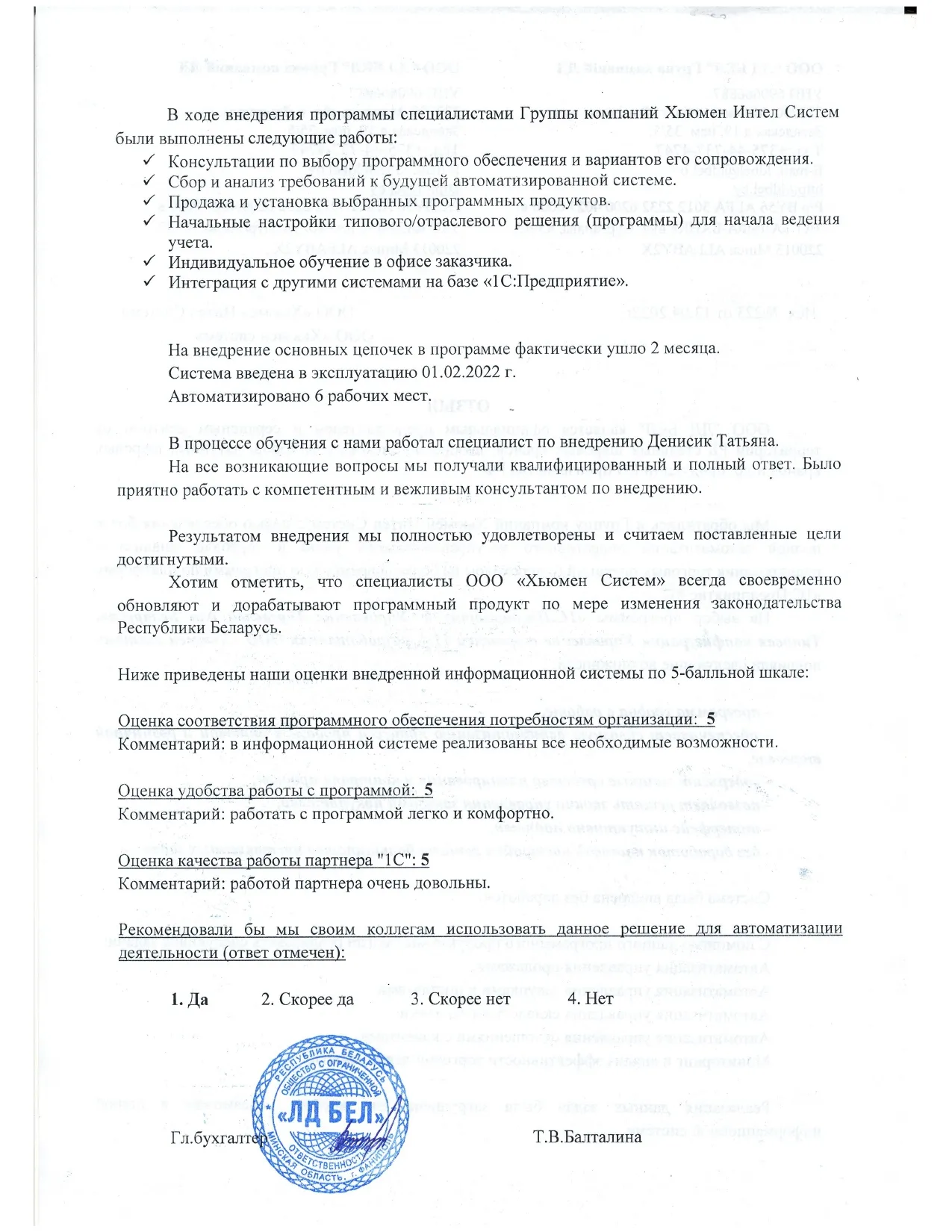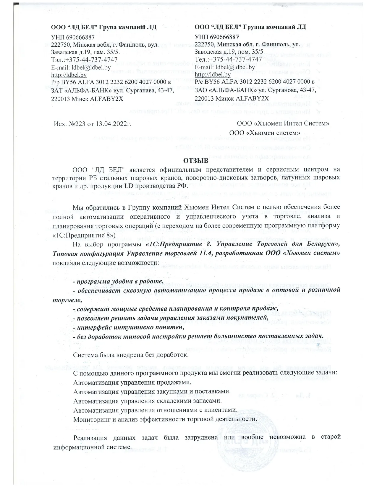 Внедрение конфигурации «Управление торговлей 8», разработанной на базе «1С:Предприятие 8. Управление торговлей для Беларуси», в Общество с ограниченной ответственностью "ЛД БЕЛ" |