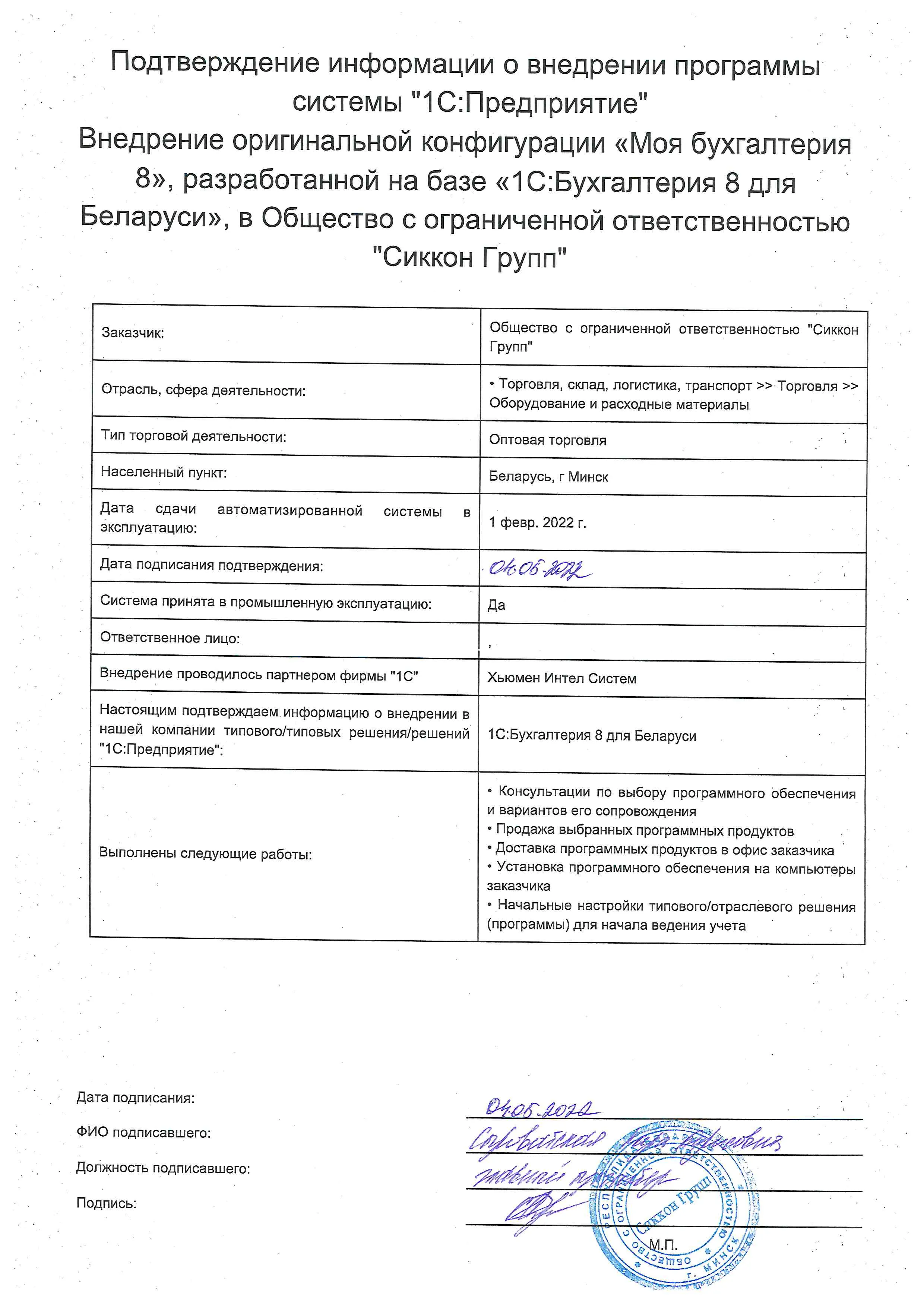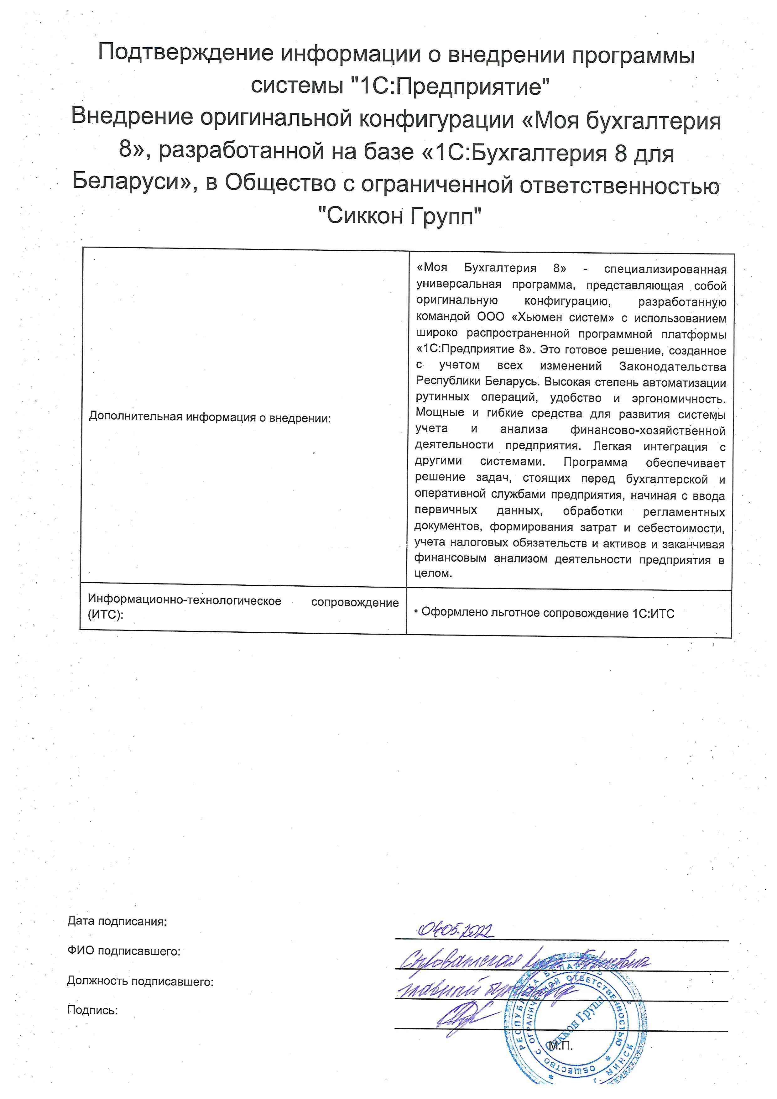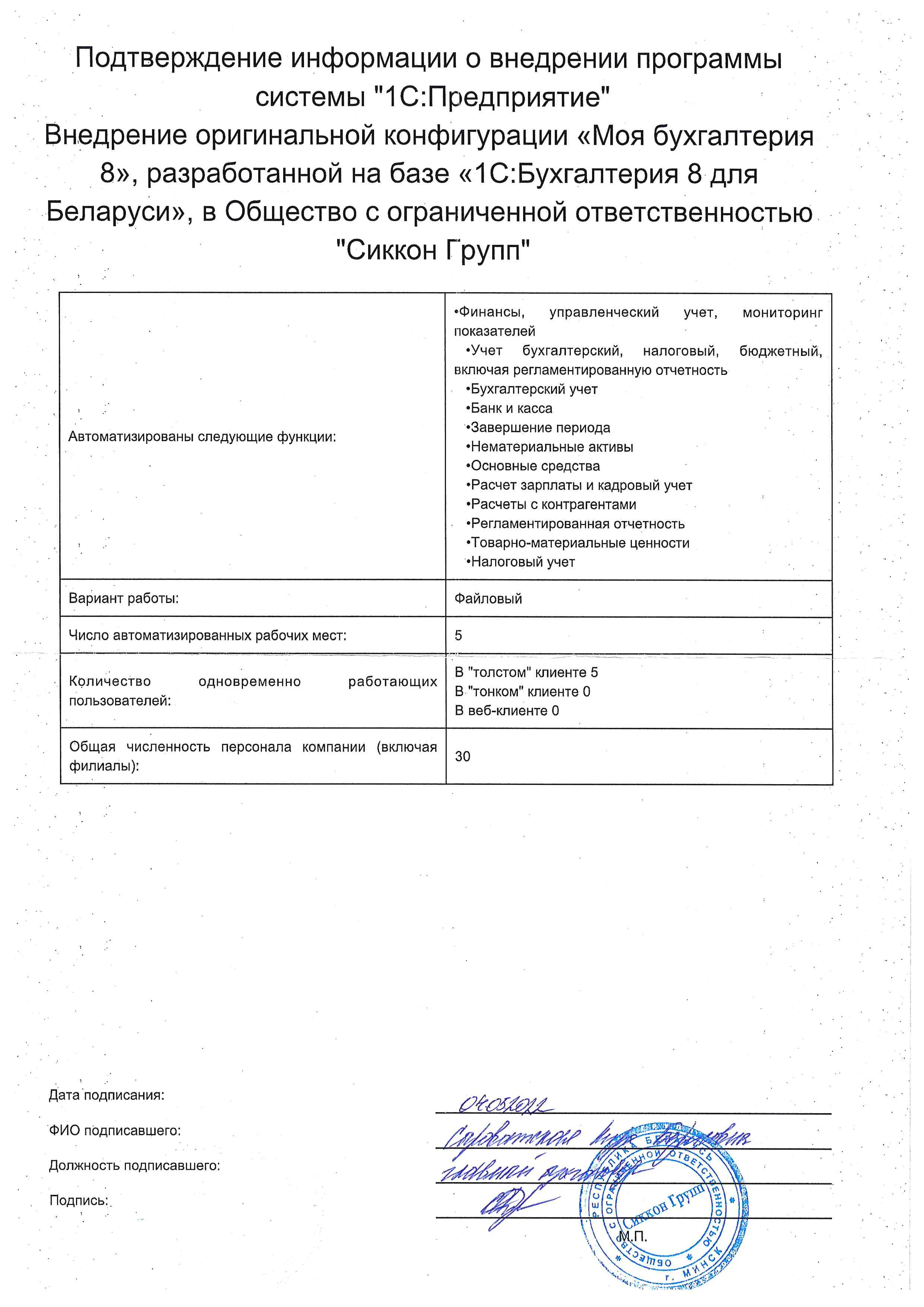Внедрение оригинальной конфигурации «Моя бухгалтерия 8», разработанной на базе «1С:Бухгалтерия 8 для Беларуси», в Общество с ограниченной ответственностью "Сиккон Групп" |