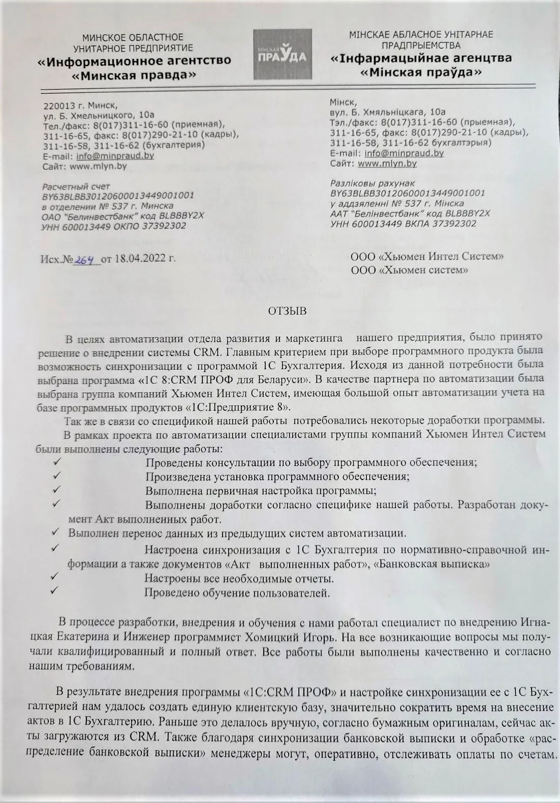 Внедрение программного продукта "1С:Предприятие 8. CRM ПРОФ для Беларуси" в Минское областное унитарное предприятие "Информационное агентство "Минская правда" |