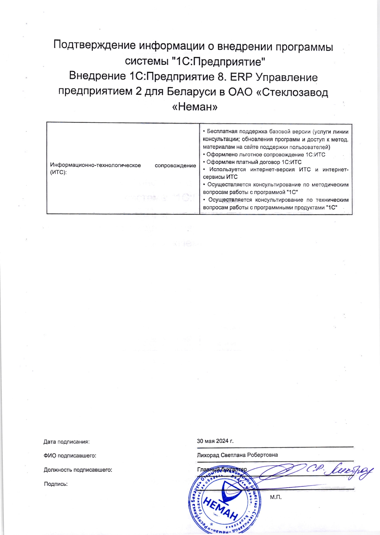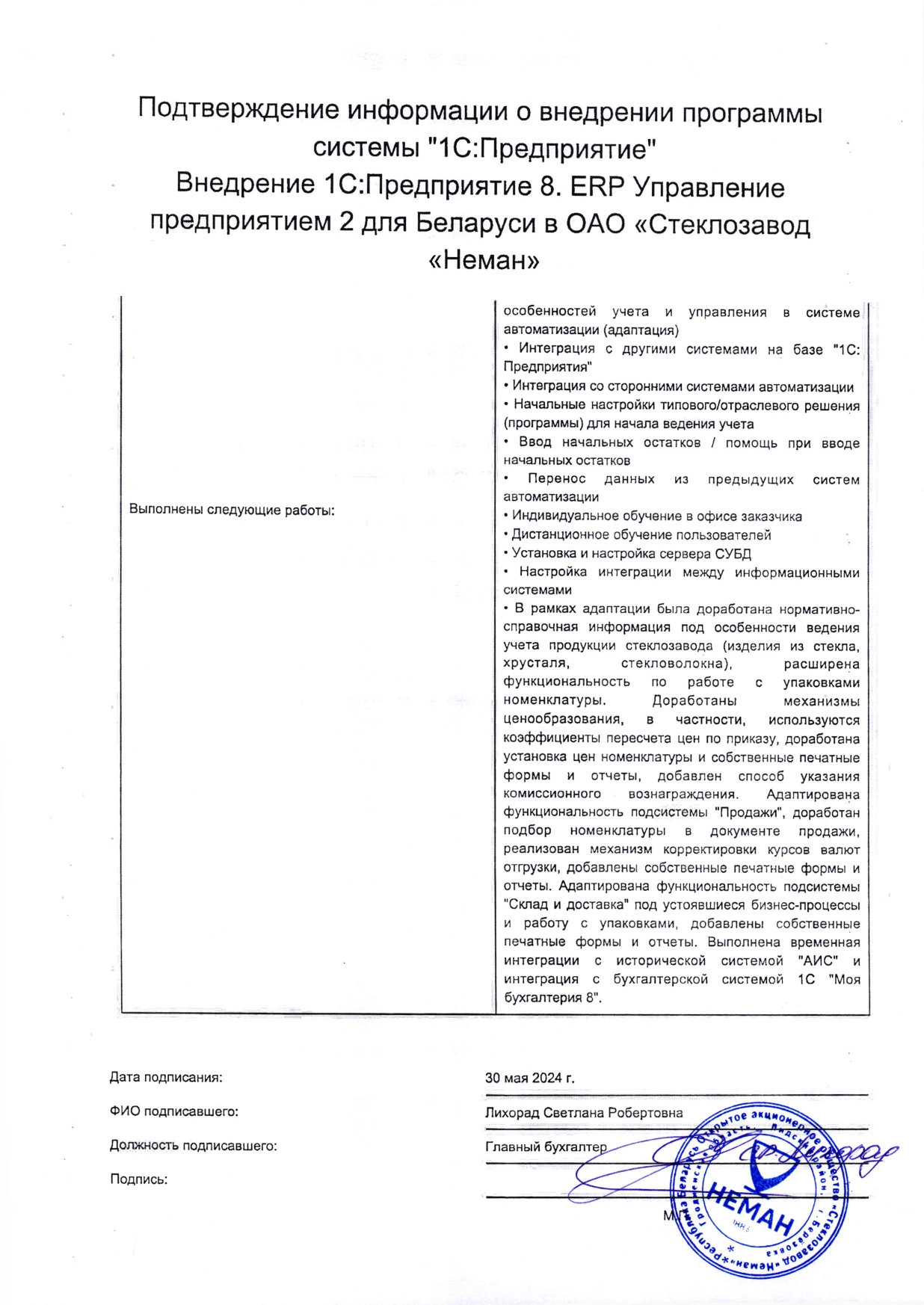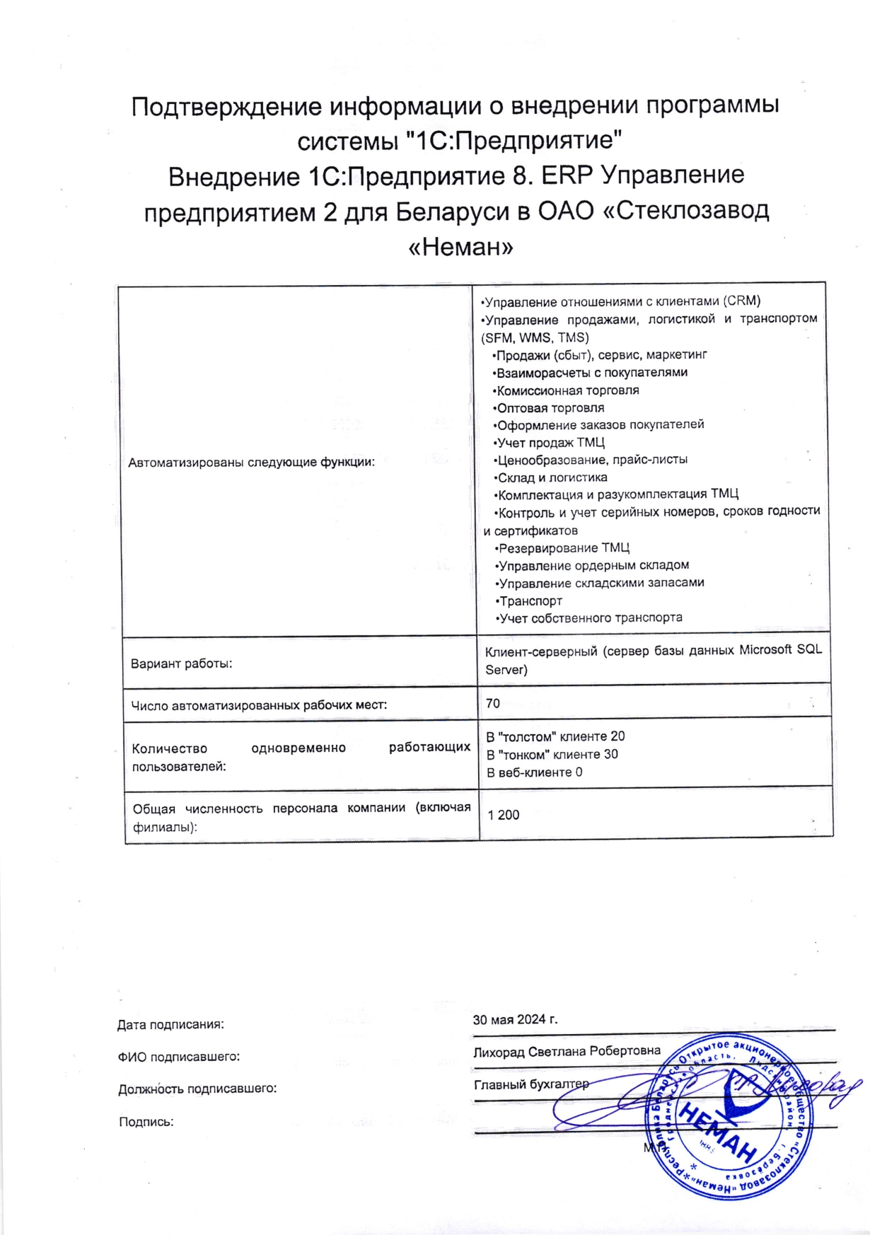 Внедрение "1С:Предприятие 8. ERP Управление предприятием 2 для Беларуси" в ОАО «Стеклозавод «Неман» |