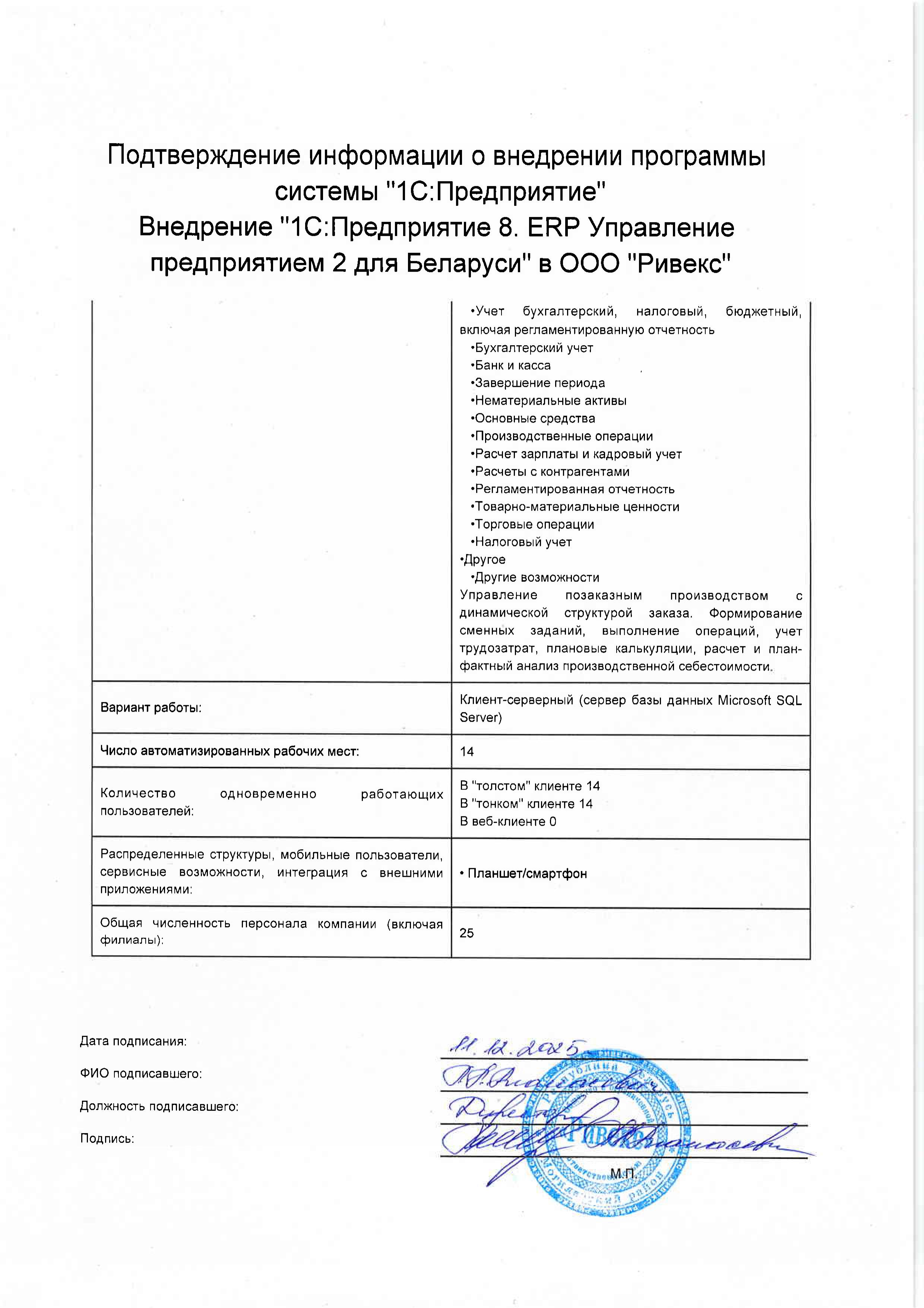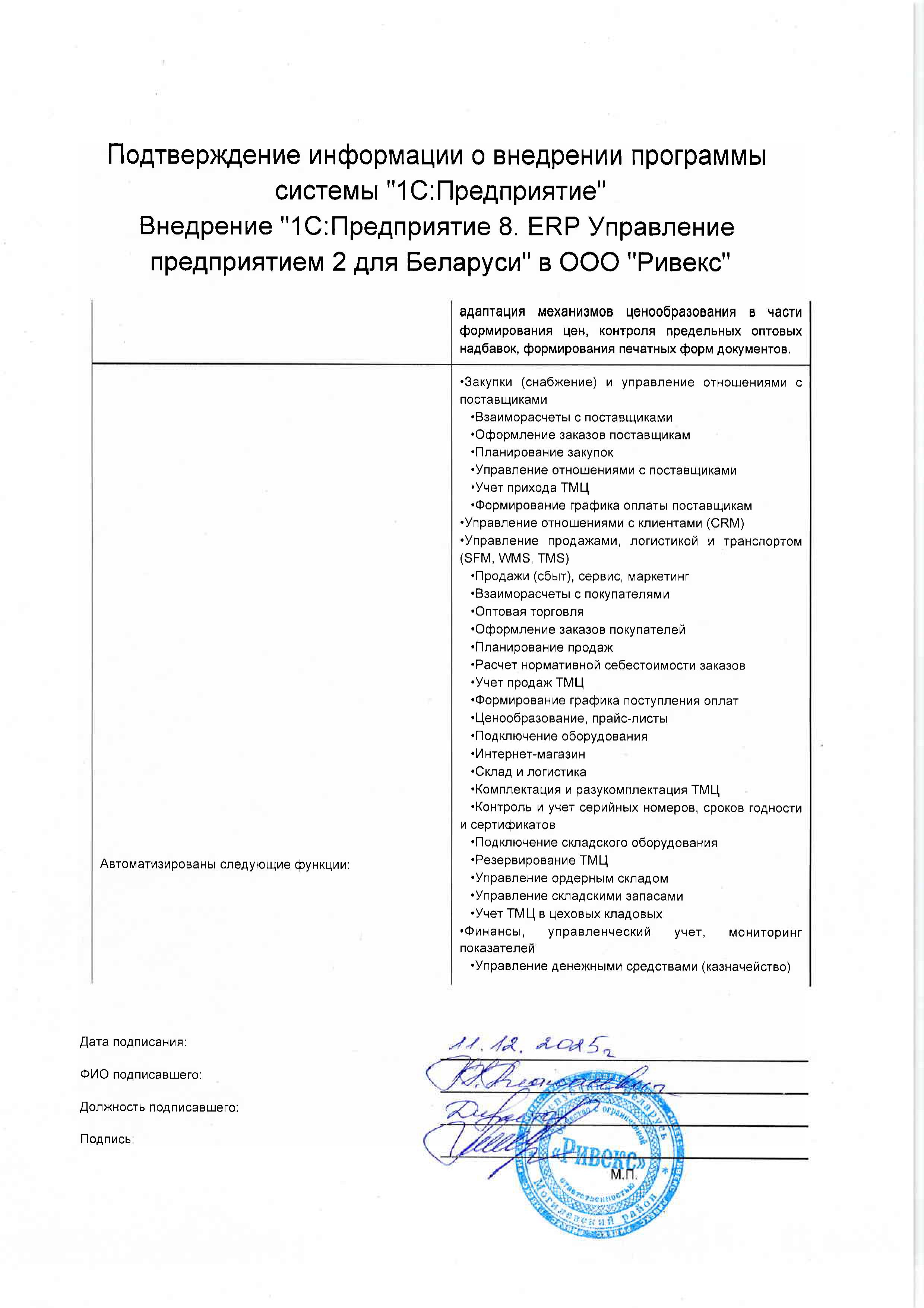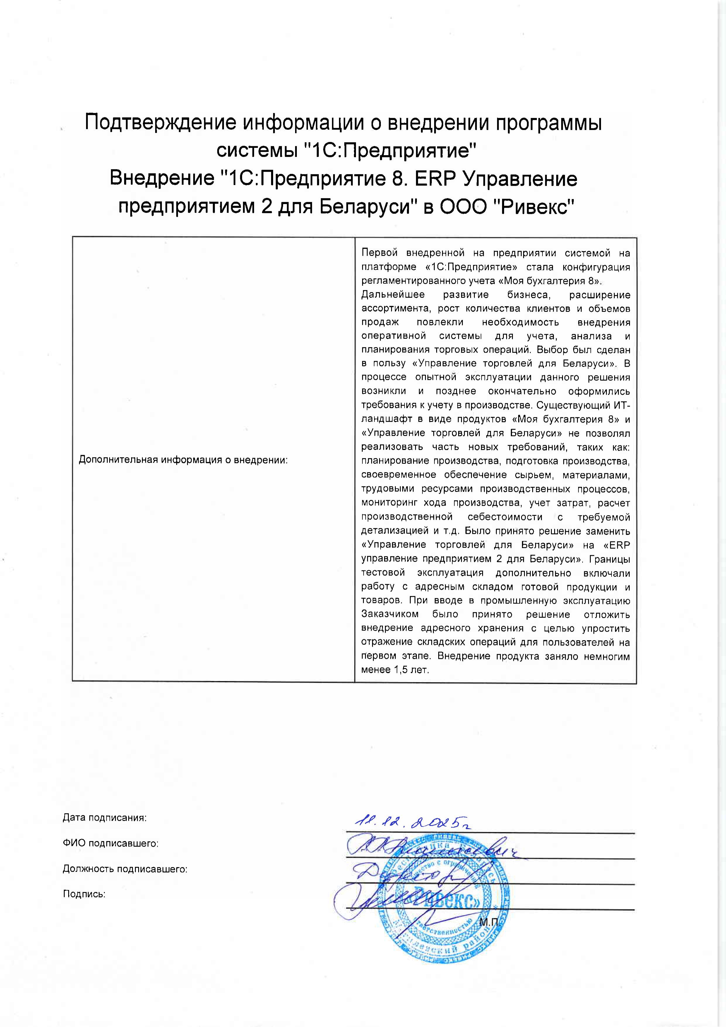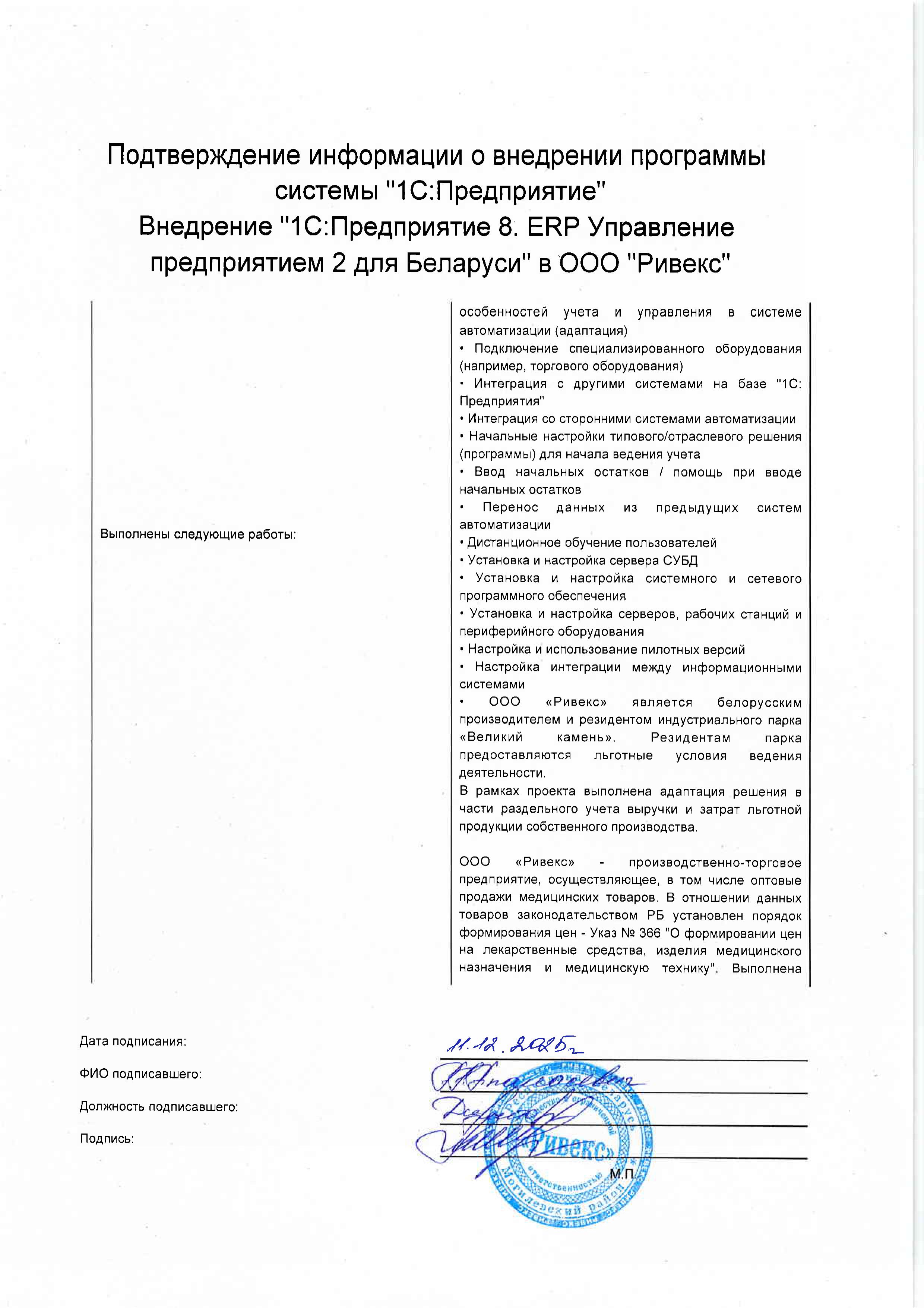 Внедрение "1С:Предприятие 8. ERP Управление предприятием 2 для Беларуси" в ООО "Ривекс" |