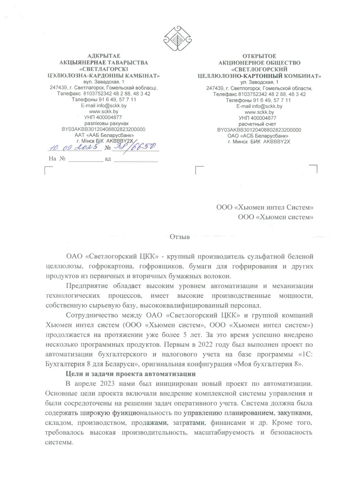Сотрудничество между ОАО «Светлогорский ЦКК» и группой компаний Хьюмен интел систем (ООО «Хьюмен систем», ООО «Хьюмен интел систем») продолжается на протяжении уже более 5 лет. За это время успешно внедрено несколько программных продуктов. Первым в 2022 году был выполнен проект по автоматизации бухгалтерского и налогового учета на базе программы «1С: Бухгалтерия 8 для Беларуси», оригинальная конфигурация «Моя бухгалтерия 8».