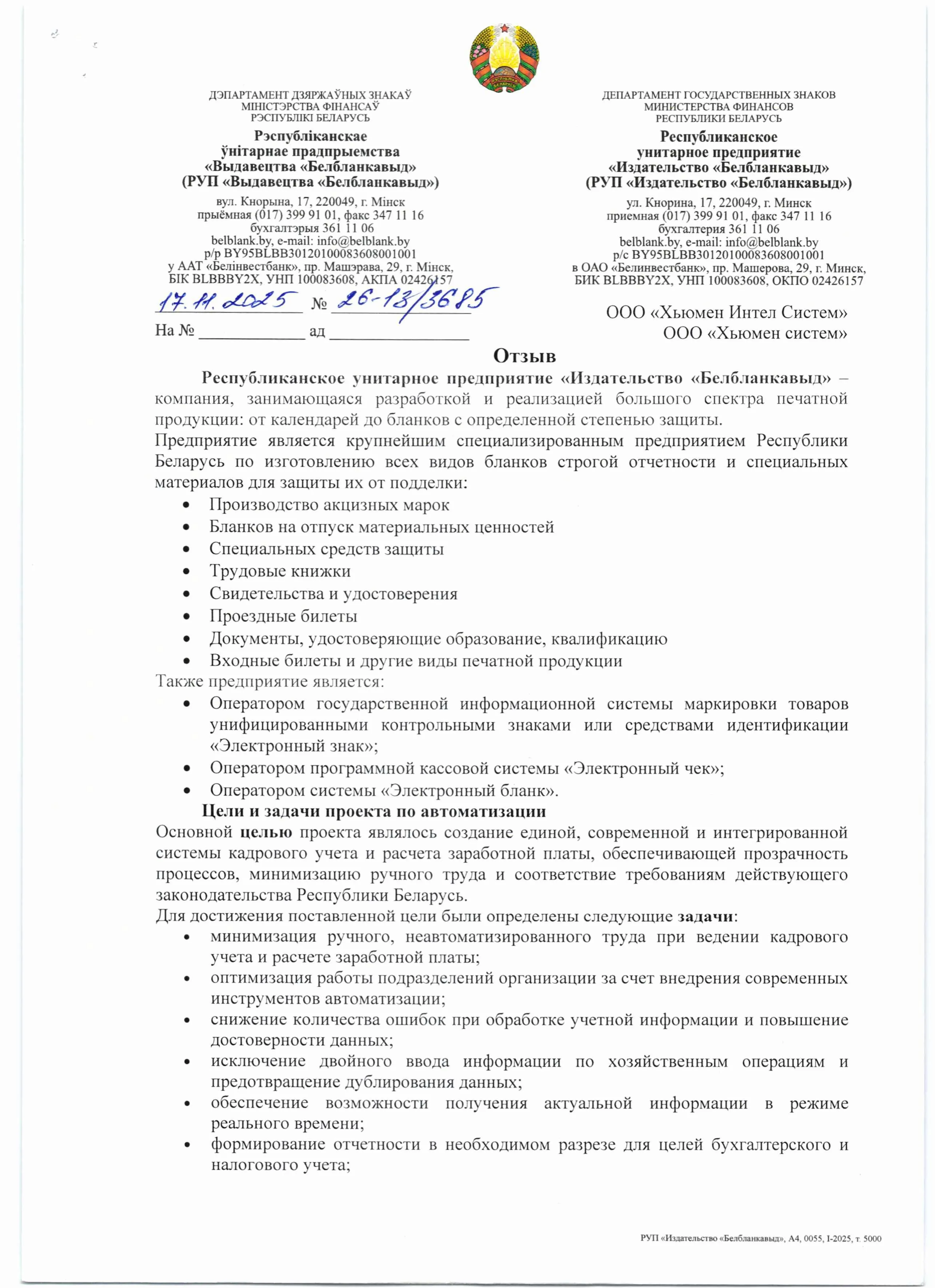 «Проект был организован и реализован на высоком профессиональном уровне. Специалисты Группы компаний «Хьюмен Интел Систем» продемонстрировали компетентность, внимательность и готовность оперативно решать возникающие вопросы. Внедрение было выполнено в сжатые сроки, несмотря на технические сложности, что подтверждает высокий уровень организации и профессионализма команды.