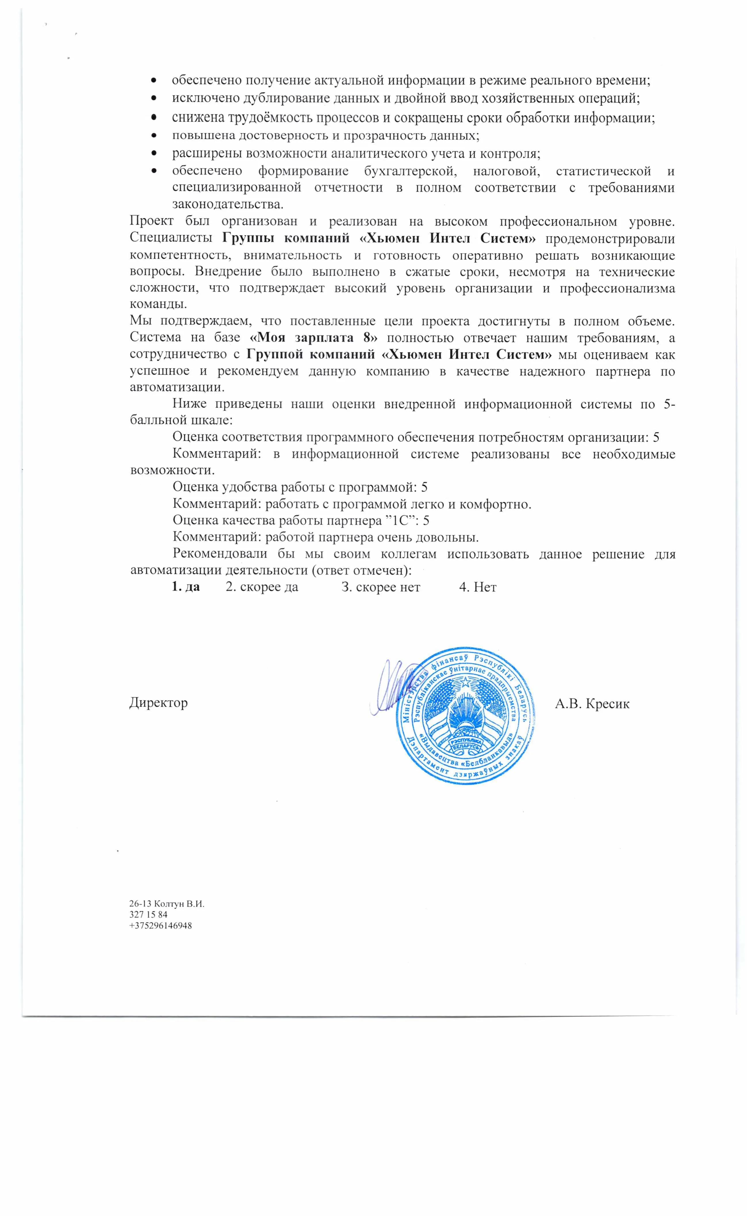 Мы подтверждаем, что поставленные цели проекта достигнуты в полном объеме. Подсистема на базе «Моя зарплата 8» полностью отвечает нашим требованиям, а сотрудничество с Группой компаний «Хьюмен Интел Систем» мы оцениваем как успешное и рекомендуем данную компанию в качестве надежного партнера по автоматизации».