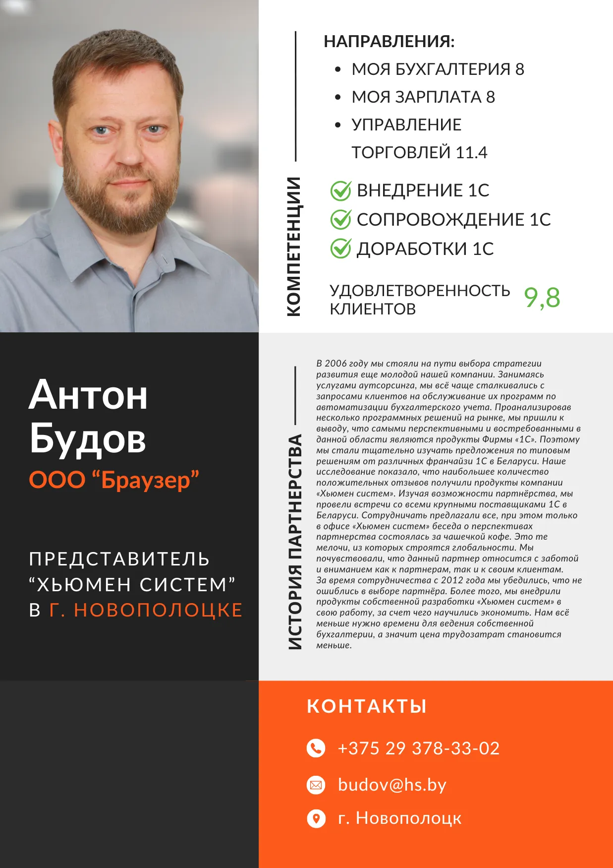 В 2006 году мы стояли на пути выбора стратегии развития еще молодой нашей компании. Занимаясь услугами аутсорсинга, мы всё чаще сталкивались с запросами клиентов на обслуживание их программ по автоматизации бухгалтерского учета. Проанализировав несколько программных решений на рынке, мы пришли к выводу, что самыми перспективными и востребованными в данной области являются продукты Фирмы «1С». Поэтому мы стали тщательно изучать предложения по типовым решениям от различных франчайзи 1С в Беларуси. Наше исследование показало, что наибольшее количество положительных отзывов получили продукты компании «Хьюмен систем». Изучая возможности партнёрства, мы провели встречи со всеми крупными поставщиками 1С в Беларуси. Сотрудничать предлагали все, при этом только в офисе «Хьюмен систем» беседа о перспективах партнерства состоялась за чашечкой кофе. Это те мелочи, из которых строятся глобальности. Мы почувствовали, что данный партнер относится с заботой и вниманием как к партнерам, так и к своим клиентам.
