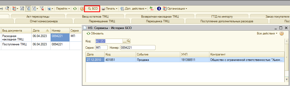 Возможность отследить историю БСО напрямую из 1С Моя бухгалтерия 8 и Управление торговлей 11.4.