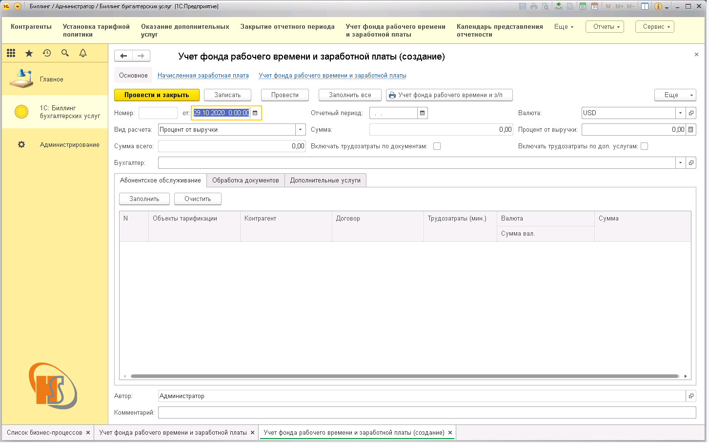 - учет использования рабочего времени обслуживающими бухгалтерами в разрезе контрагентов, видов услуг за любой период